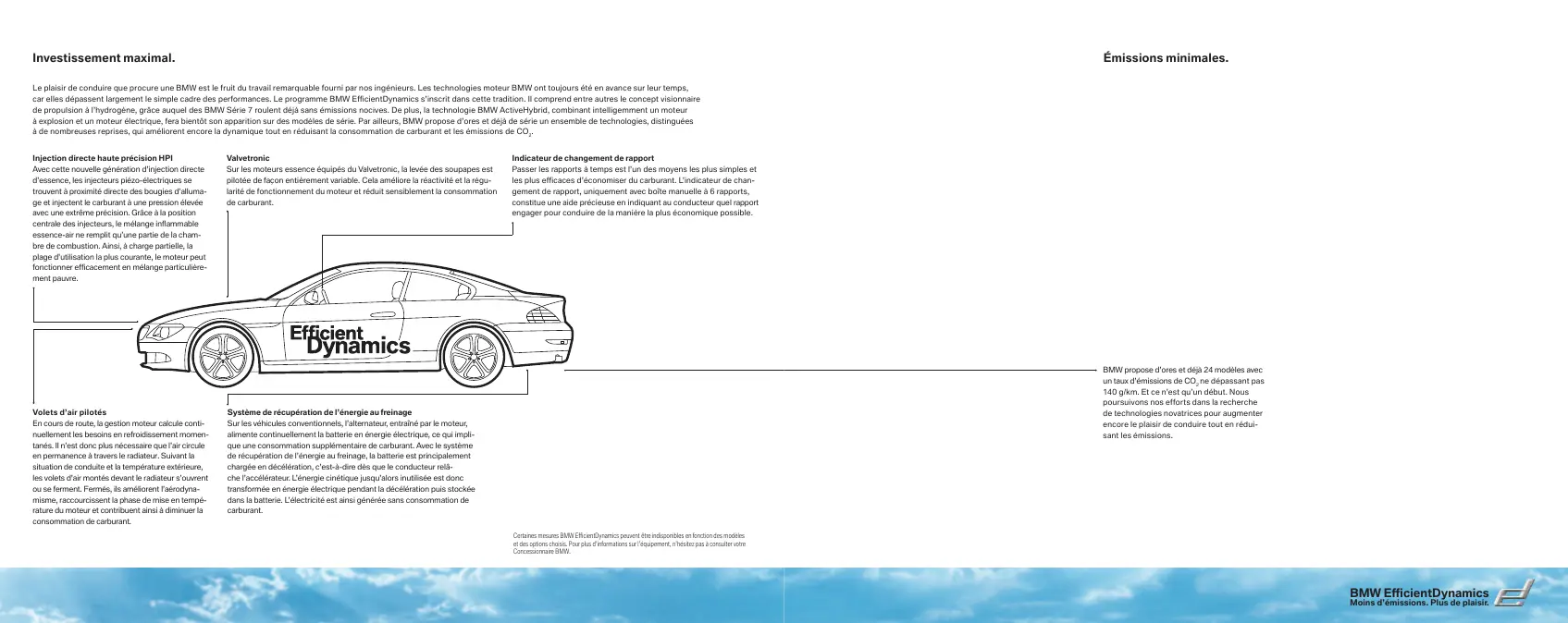 BMW Série 6 Coupé BMW Série 6 Cabriolet www.bmw.fr BMW SÉRIE 6. COUPÉ ET CABRIOLET. L’ART DE SUBLIMER LE PLAISIR. Le plaisir de conduire La performance peut prendre de nombreuses formes. En voici la plus belle. Quel dommage que vous ne puissiez pas voir votre coupé plus souvent de l’extérieur ! Prenez deux profondes inspirations. Pour conquérir le monde, il faut d’abord partir à sa découverte. La vie est trop belle pour être obligé de choisir. Émissions minimales. Investissement maximal. Le plaisir de conduire que procure une BMW est le fruit du travail remarquable fourni par nos ingénieurs. Les technologies moteur BMW ont toujours été en avance sur leur temps, car elles dépassent largement le simple cadre des performances. Le programme BMW EfficientDynamics s’inscrit dans cette tradition. Il comprend entre autres le concept visionnaire de propulsion à l’hydrogène, grâce auquel des BMW Série 7 roulent déjà sans émissions nocives. De plus, la technologie BMW ActiveHybrid, combinant intelligemment un moteur à explosion et un moteur électrique, fera bientôt son apparition sur des modèles de série. Par ailleurs, BMW propose d’ores et déjà de série un ensemble de technologies, distinguées à de nombreuses reprises, qui améliorent encore la dynamique tout en réduisant la consommation de carburant et les émissions de CO2. Injection directe haute précision HPI Avec cette nouvelle génération d’injection directe d’essence, les injecteurs piézo-électriques se trouvent à proximité directe des bougies d’allumage et injectent le carburant à une pression élevée avec une extrême précision. Grâce à la position centrale des injecteurs, le mélange inflammable essence-air ne remplit qu’une partie de la chambre de combustion. Ainsi, à charge partielle, la plage d’utilisation la plus courante, le moteur peut fonctionner efficacement en mélange particulièrement pauvre. Volets d’air pilotés En cours de route, la gestion moteur calcule continuellement les besoins en refroidissement momentanés. Il n’est donc plus nécessaire que l’air circule en permanence à travers le radiateur. Suivant la situation de conduite et la température extérieure, les volets d’air montés devant le radiateur s’ouvrent ou se ferment. Fermés, ils améliorent l’aérodynamisme, raccourcissent la phase de mise en température du moteur et contribuent ainsi à diminuer la consommation de carburant. Valvetronic Sur les moteurs essence équipés du Valvetronic, la levée des soupapes est pilotée de façon entièrement variable. Cela améliore la réactivité et la régularité de fonctionnement du moteur et réduit sensiblement la consommation de carburant. Indicateur de changement de rapport Passer les rapports à temps est l’un des moyens les plus simples et les plus efficaces d’économiser du carburant. L’indicateur de changement de rapport, uniquement avec boîte manuelle à 6 rapports, constitue une aide précieuse en indiquant au conducteur quel rapport engager pour conduire de la manière la plus économique possible. BMW propose d’ores et déjà 24 modèles avec un taux d’émissions de CO2 ne dépassant pas 140 g/km. Et ce n’est qu’un début. Nous poursuivons nos efforts dans la recherche de technologies novatrices pour augmenter encore le plaisir de conduire tout en réduisant les émissions. Système de récupération de l’énergie au freinage Sur les véhicules conventionnels, l’alternateur, entraîné par le moteur, alimente continuellement la batterie en énergie électrique, ce qui implique une consommation supplémentaire de carburant. Avec le système de récupération de l’énergie au freinage, la batterie est principalement chargée en décélération, c’est-à-dire dès que le conducteur relâche l’accélérateur. L’énergie cinétique jusqu’alors inutilisée est donc transformée en énergie électrique pendant la décélération puis stockée dans la batterie. L’électricité est ainsi générée sans consommation de carburant. Certaines mesures BMW EfficientDynamics peuvent être indisponibles en fonction des modèles et des options choisis. Pour plus d’informations sur l’équipement, n’hésitez pas à consulter votre Concessionnaire BMW. BMW EfficientDynamics Moins d’émissions. Plus de plaisir. s Série o Option s Les lave-projecteurs sont les garants d’un éclairage optimal des phares par tous les temps. Lorsque les phares sont allumés et que le nettoyage du pare-brise est activé, les lave-projecteurs sont automatiquement mis en marche. s Les clignotants blancs, à technologie DEL (Diode Électroluminescente), très esthétiques, renforcent encore le caractère très dynamique de la BMW Série 6. s Projecteurs bi-Xénon, avec quatre anneaux lumineux pour fonction d’éclairage diurne et réglage automatique de la portée des projecteurs. Ils éclairent nettement la chaussée la nuit, même par mauvais temps ou lorsque la visibilité est réduite. o Les projecteurs directionnels, disponibles en option, avec répartition variable de la lumière, éclairent le tracé des virages grâce à une commande électromécanique qui fait pivoter les phares dès que le conducteur tourne le volant pour s’engager dans le virage. o Feux de route adaptatifs. Ils assistent le conducteur la nuit en allumant les feux de route si nécessaire et en repassant en feux de croisement pour ne pas éblouir les autres usagers ou si la chaussée est suffisamment éclairée. s Les clignotants latéraux à l’avant ajoutent une touche originale sur le flanc de la BMW Série 6. s Projecteurs antibrouillard intégrés dans la jupe avant. Ils offrent un surcroît de sécurité en cas de mauvaise visibilité. La technique des surfaces ellipsoïdales complexes permet une diffusion très homogène de la lumière sur la chaussée. s Feux de stop bi-intensité. Ils permettent aux conducteurs qui vous suivent de mieux é