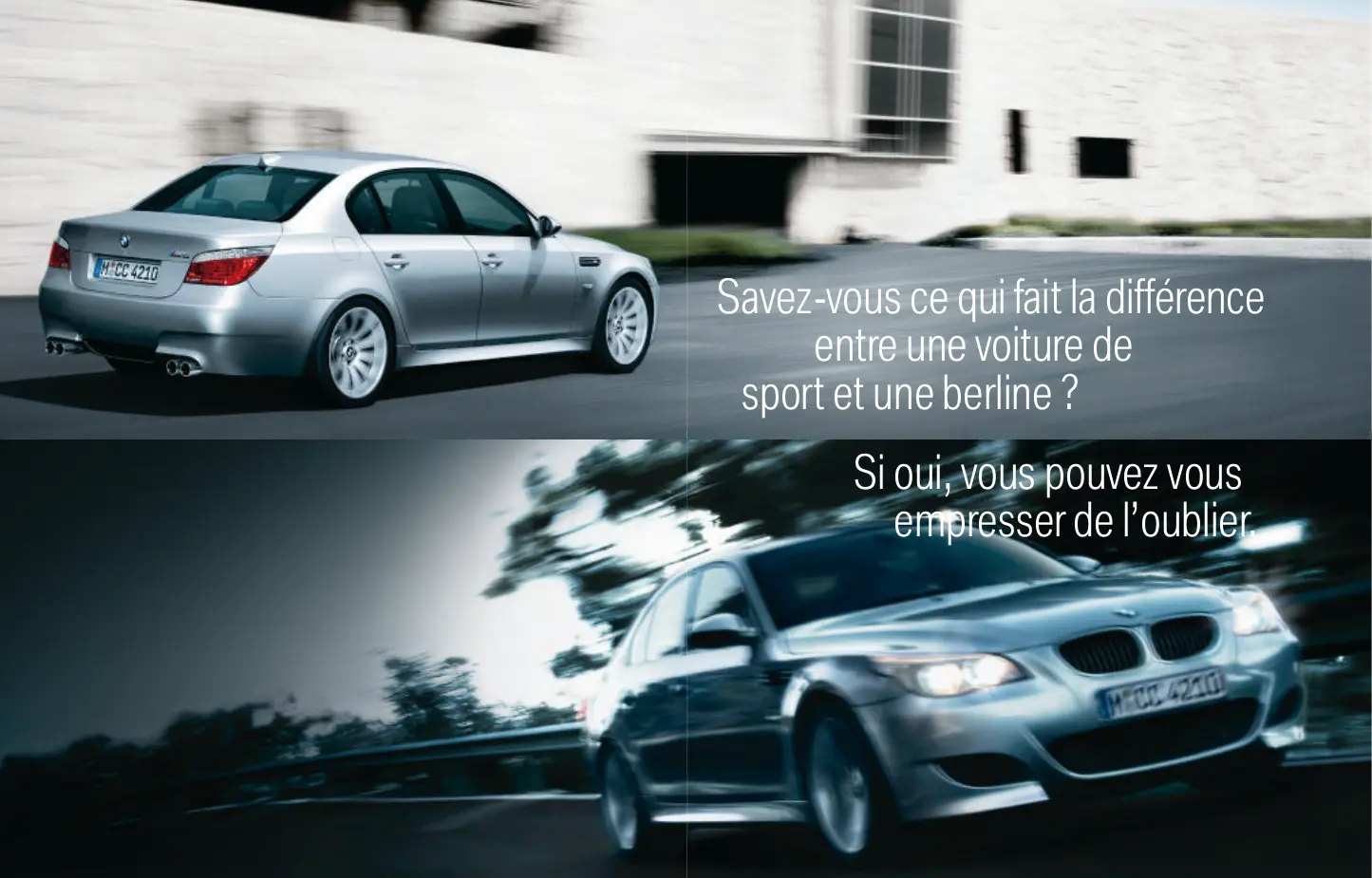 BMW M5 Berline BMW M5 Touring Le plaisir de conduire Savez-vous ce qui fait la différence entre une voiture de sport et une berline ? Si oui, vous pouvez vous empresser de l’oublier. Dommage que vous n’ayez ici que l’image et pas le son. Un seul mot qui en dit long sur le dynamisme de la M5 : Waouh ! Tournez la page – elle a envie de bouger. Un véhicule de loisirs... ... et quels loisirs ! Sur cette photo se cache une voiture de sport.