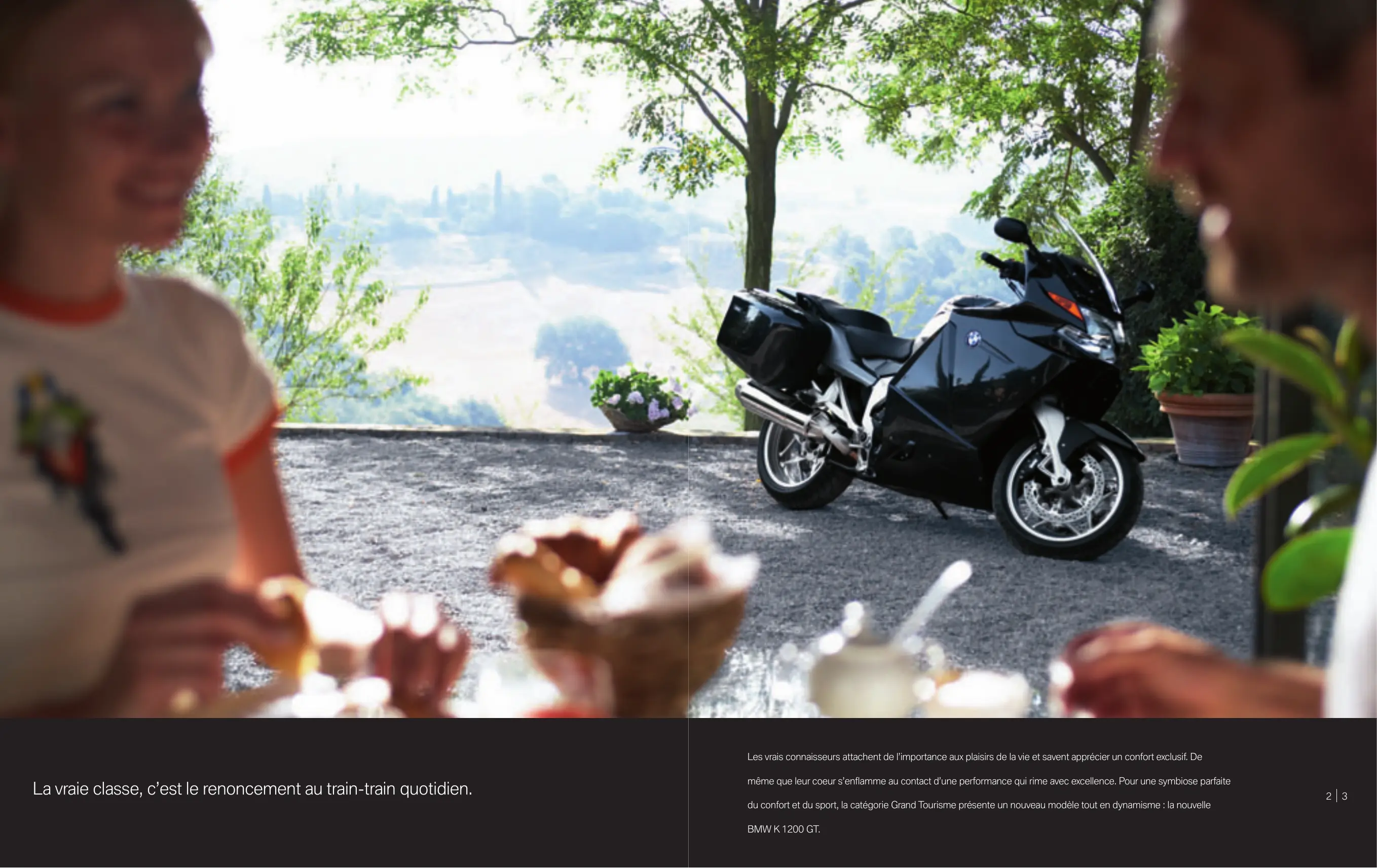 - L!excellence en mouvement Les vrais connaisseurs attachent de l!importance aux plaisirs de la vie et savent apprécier un confort exclusif. De La vraie classe, c!est le renoncement au train-train quotidien. même que leur coeur s!en!amme au contact d!une performance qui rime avec excellence. Pour une symbiose parfaite du confort et du sport, la catégorie Grand Tourisme présente un nouveau modèle tout en dynamisme : la nouvelle BMW K 1200 GT.