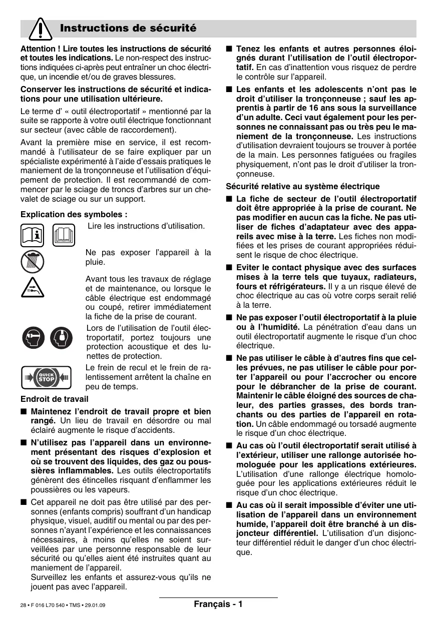 Instructions de sécurité Attention ! Lire toutes les instructions de sécurité et toutes les indications. Le non-respect des instructions indiquées ci-après peut entraîner un choc électrique, un incendie et/ou de graves blessures. Conserver les instructions de sécurité et indications pour une utilisation ultérieure. Le terme d’ « outil électroportatif » mentionné par la suite se rapporte à votre outil électrique fonctionnant sur secteur (avec câble de raccordement). Avant la première mise en service, il est recommandé à l’utilisateur de se faire expliquer par un spécialiste expérimenté à l’aide d’essais pratiques le maniement de la tronçonneuse et l’utilisation d’équipement de protection. Il est recommandé de commencer par le sciage de troncs d’arbres sur un chevalet de sciage ou sur un support. Explication des symboles : Lire les instructions d’utilisation. Ne pas exposer l’appareil à la pluie. Avant tous les travaux de réglage et de maintenance, ou lorsque le câble électrique est endommagé ou coupé, retirer immédiatement la fiche de la prise de courant. Lors de l’utilisation de l’outil électroportatif, portez toujours une protection acoustique et des lunettes de protection. Le frein de recul et le frein de ralentissement arrêtent la chaîne en peu de temps. Endroit de travail ■ Maintenez l’endroit de travail propre et bien rangé. Un lieu de travail en désordre ou mal éclairé augmente le risque d’accidents. ■ N’utilisez pas l’appareil dans un environnement présentant des risques d’explosion et où se trouvent des liquides, des gaz ou poussières inflammables. Les outils électroportatifs génèrent des étincelles risquant d’enflammer les poussières ou les vapeurs. ■ Cet appareil ne doit pas être utilisé par des personnes (enfants compris) souffrant d’un handicap physique, visuel, auditif ou mental ou par des personnes n’ayant l’expérience et les connaissances nécessaires, à moins qu’elles ne soient surveillées par une personne responsable de leur sécurité ou qu’elles aient été instruites quant au maniement de l’appareil. Surveillez les enfants et assurez-vous qu’ils ne jouent pas avec l’appareil. 28 • F 016 L70 540 • TMS • 29.01.09