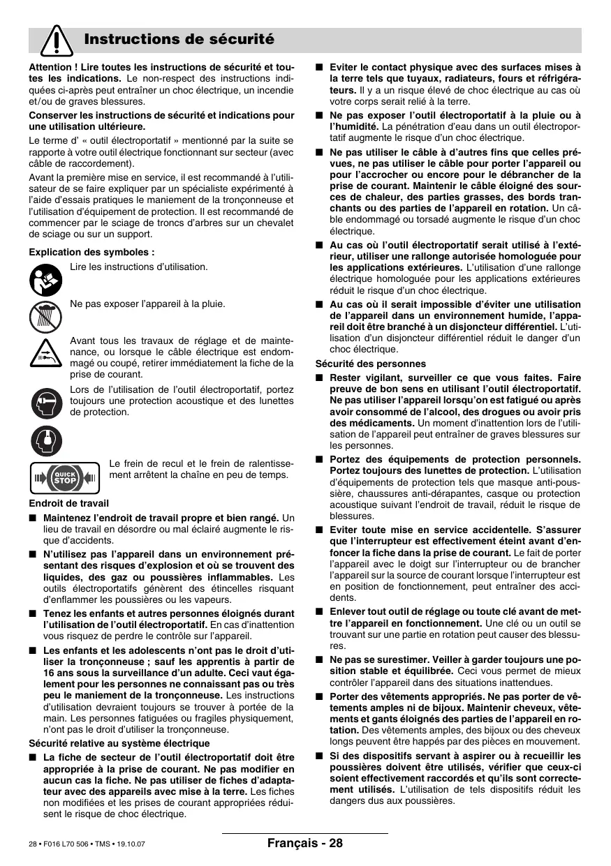 Endroit de travail ■ Maintenez l’endroit de travail propre et bien rangé. Un lieu de travail en désordre ou mal éclairé augmente le risque d’accidents. ■ N’utilisez pas l’appareil dans un environnement présentant des risques d’explosion et où se trouvent des liquides, des gaz ou poussières inflammables. Les outils électroportatifs génèrent des étincelles risquant d’enflammer les poussières ou les vapeurs. ■ Tenez les enfants et autres personnes éloignés durant l’utilisation de l’outil électroportatif. En cas d’inattention vous risquez de perdre le contrôle sur l’appareil. ■ Les enfants et les adolescents n’ont pas le droit d’utiliser la tronçonneuse ; sauf les apprentis à partir de 16 ans sous la surveillance d’un adulte. Ceci vaut également pour les personnes ne connaissant pas ou très peu le maniement de la tronçonneuse. Les instructions d’utilisation devraient toujours se trouver à portée de la main. Les personnes fatiguées ou fragiles physiquement, n’ont pas le droit d’utiliser la tronçonneuse. Sécurité relative au système électrique ■ La fiche de secteur de l’outil électroportatif doit être appropriée à la prise de courant. Ne pas modifier en aucun cas la fiche. Ne pas utiliser de fiches d’adaptateur avec des appareils avec mise à la terre. Les fiches non modifiées et les prises de courant appropriées réduisent le risque de choc électrique. 28 • F016 L70 506 • TMS • 19.10.07