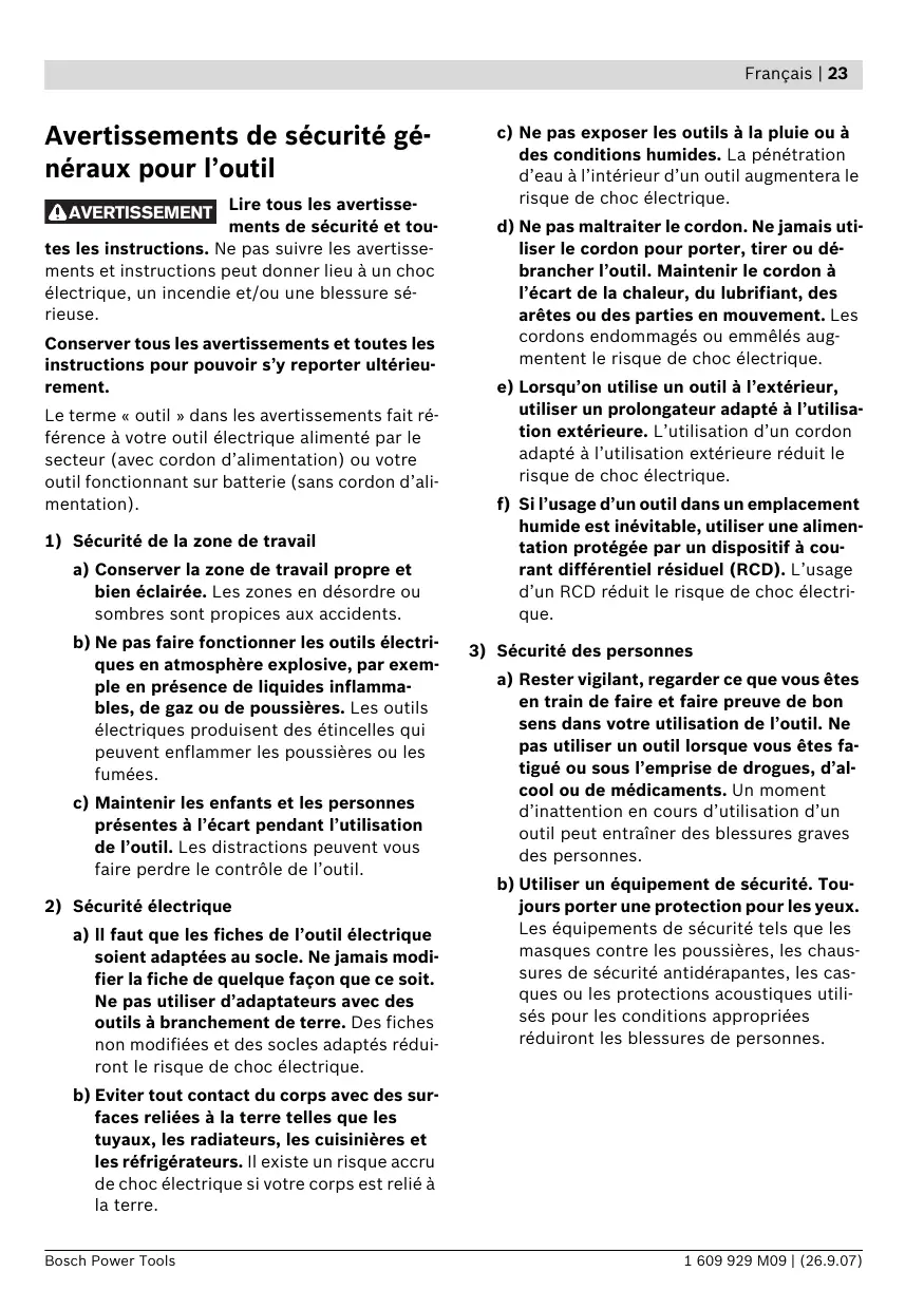 a) Rester vigilant, regarder ce que vous êtes en train de faire et faire preuve de bon sens dans votre utilisation de l’outil. Ne pas utiliser un outil lorsque vous êtes fatigué ou sous l’emprise de drogues, d’alcool ou de médicaments. Un moment d’inattention en cours d’utilisation d’un outil peut entraîner des blessures graves des personnes. b) Utiliser un équipement de sécurité. Toujours porter une protection pour les yeux. Les équipements de sécurité tels que les masques contre les poussières, les chaussures de sécurité antidérapantes, les casques ou les protections acoustiques utilisés pour les conditions appropriées réduiront les blessures de personnes. b) Eviter tout contact du corps avec des surfaces reliées à la terre telles que les tuyaux, les radiateurs, les cuisinières et les réfrigérateurs. Il existe un risque accru de choc électrique si votre corps est relié à la terre. Bosch Power Tools 1 609 929 M09 | (26.9.07) 24 | Français c) Eviter tout démarrage intempestif. S’assurer que l’interrupteur est en position arrêt avant de brancher l’outil au secteur et/ou au bloc de batteries, de le ramasser ou de le porter. Porter les outils en ayant le doigt sur l’interrupteur ou brancher des outils dont l’interrupteur est en position marche est source d’accidents. d) Retirer toute clé de réglage avant de mettre l’outil en marche. Une clé laissée fixée sur une partie tournante de l’outil peut donner lieu à des blessures de personnes. e) Ne pas se précipiter. Garder une position et un équilibre adaptés à tout moment. Cela permet un meilleur contrôle de l’outil dans des situations inattendues. f) S’habiller de manière adaptée. Ne pas porter de vêtements amples ou de bijoux. Garder les cheveux, les vêtements et les gants à distance des parties en mouvement. Des vêtements amples, des bijoux ou les cheveux longs peuvent être pris dans des parties en mouvement. g) Si des dispositifs sont fournis pour le raccordement d’équipements pour l’extraction et la récupération des poussières, s’assurer qu’ils sont connectés et correctement utilisés. Utiliser des collecteurs de poussière peut réduire les risques dus aux poussières.