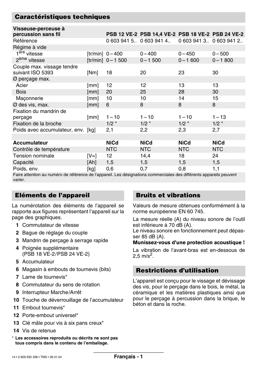 - Des idées en action. Caractéristiques techniques Visseuse-perceuse à percussion sans fil Référence Régime à vide 1ère vitesse 2ème vitesse Couple max. vissage tendre suivant ISO 5393 Ø perçage max. Acier Bois Maçonnerie Ø des vis, max. Fixation du mandrin de perçage Fixation de la broche Poids avec accumulateur, env. Accumulateur Contrôle de température Tension nominale Capacité Poids, env. Faire attention au numéro de référence de l’appareil. Les désignations commerciales des différents appareils peuvent varier. Eléments de l’appareil Bruits et vibrations La numérotation des éléments de l’appareil se rapporte aux figures représentant l’appareil sur la page des graphiques. 1 Commutateur de vitesse 2 Bague de réglage du couple 3 Mandrin de perçage à serrage rapide 4 Poignée supplémentaire (PSB 18 VE-2/PSB 24 VE-2) 5 Accumulateur 6 Magasin à embouts de tournevis (bits) 7 Lame de tournevis* 8 Commutateur du sens de rotation 9 Interrupteur Marche/Arrêt 10 Touche de déverrouillage de l’accumulateur 11 Embout tournevis* 12 Porte-embout universel* 13 Clé mâle pour vis à six pans creux* 14 Vis de retenue Valeurs de mesure obtenues conformément à la norme européenne EN 60 745. La mesure réelle (A) du niveau sonore de l’outil est inférieure à 70 dB (A). Le niveau sonore en fonctionnement peut dépasser 85 dB (A). Munissez-vous d’une protection acoustique ! La vibration de l’avant-bras est en-dessous de 2,5 m/s2. Restrictions d’utilisation L’appareil est conçu pour le vissage et dévissage des vis, pour le perçage dans le bois, le métal, la céramique et les matières plastiques ainsi que pour le perçage à percussion dans la brique, le béton et dans la roche.