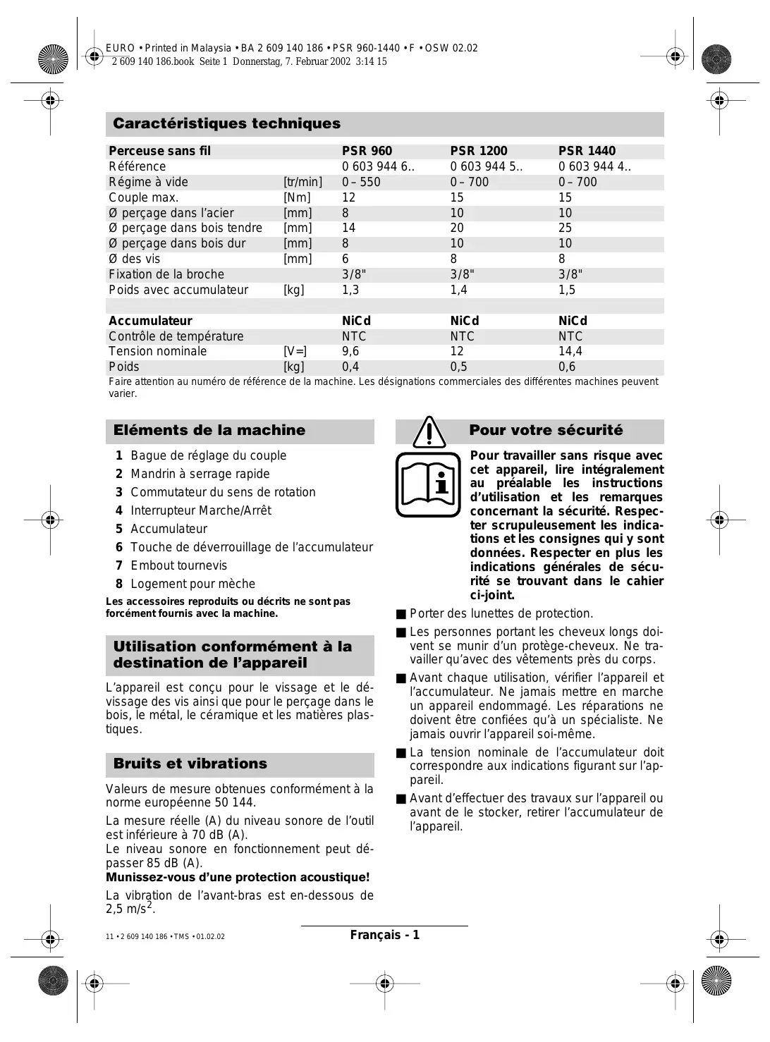 Bruits et vibrations Valeurs de mesure obtenues conformément à la norme européenne 50 144. La mesure réelle (A) du niveau sonore de l’outil est inférieure à 70 dB (A). Le niveau sonore en fonctionnement peut dépasser 85 dB (A). Munissez-vous d’une protection acoustique! La vibration de l’avant-bras est en-dessous de 2,5 m/s2. 11 • 2 609 140 186 • TMS • 01.02.02