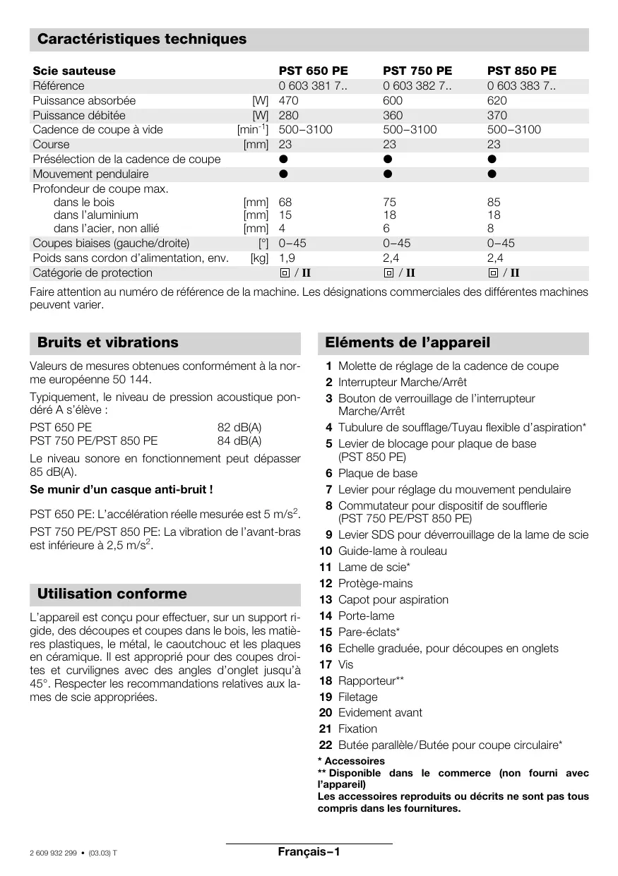 84 dB(A) Le niveau sonore en fonctionnement peut dépasser 85 dB(A). Se munir d’un casque anti-bruit ! PST 650 PE: L’accélération réelle mesurée est 5 m/s2. PST 750 PE/PST 850 PE: La vibration de l’avant-bras est inférieure à 2,5 m/s2. Utilisation conforme L’appareil est conçu pour effectuer, sur un support rigide, des découpes et coupes dans le bois, les matières plastiques, le métal, le caoutchouc et les plaques en céramique. Il est approprié pour des coupes droites et curvilignes avec des angles d’onglet jusqu’à 45°. Respecter les recommandations relatives aux lames de scie appropriées. 1 Molette de réglage de la cadence de coupe 2 Interrupteur Marche/Arrêt 3 Bouton de verrouillage de l’interrupteur Marche/Arrêt 4 Tubulure de soufflage/Tuyau flexible d’aspiration* 5 Levier de blocage pour plaque de base (PST 850 PE) 6 Plaque de base 7 Levier pour réglage du mouvement pendulaire 8 Commutateur pour dispositif de soufflerie (PST 750 PE/PST 850 PE) 9 Levier SDS pour déverrouillage de la lame de scie 10 Guide-lame à rouleau 11 Lame de scie* 12 Protège-mains 13 Capot pour aspiration 14 Porte-lame 15 Pare-éclats* 16 Echelle graduée, pour découpes en onglets 17 Vis 18 Rapporteur** 19 Filetage 20 Evidement avant 21 Fixation 22 Butée parallèle/Butée pour coupe circulaire*