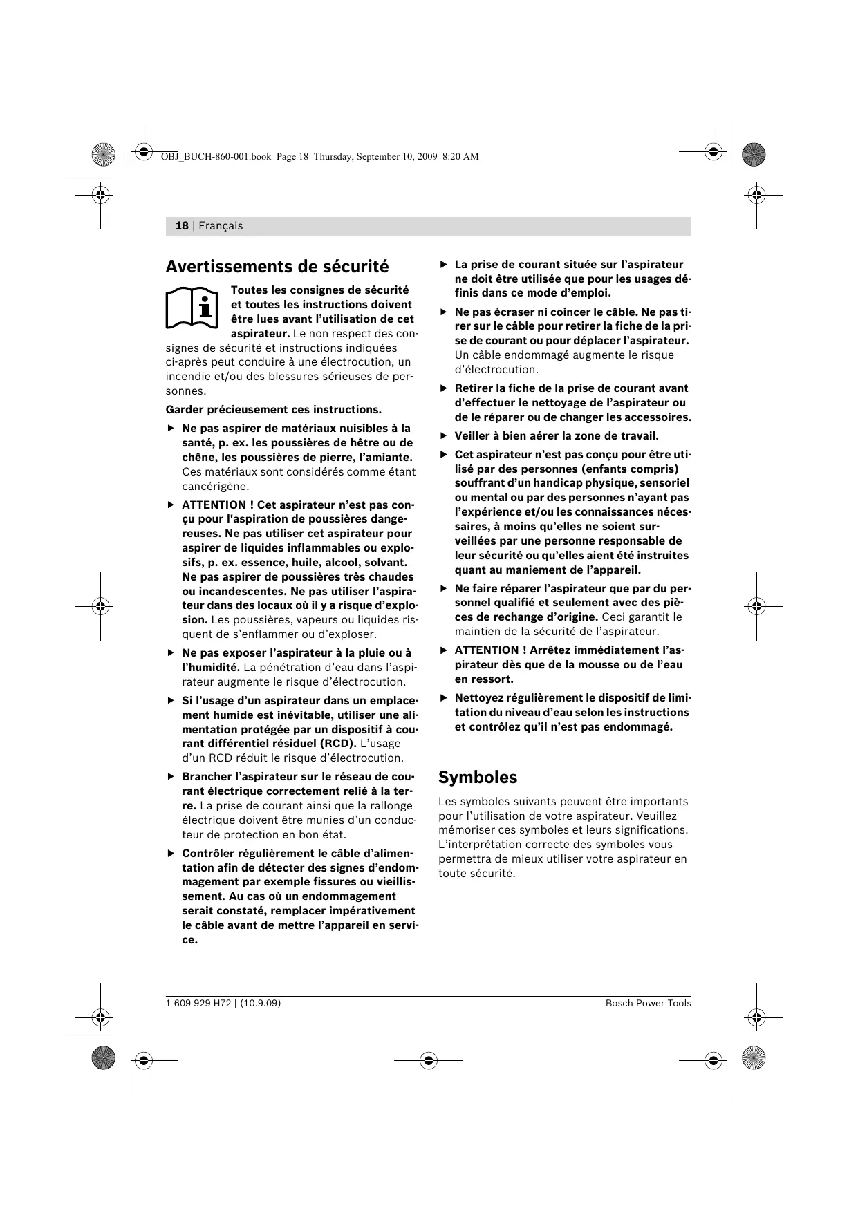 Toutes les consignes de sécurité et toutes les instructions doivent être lues avant l’utilisation de cet aspirateur. Le non respect des consignes de sécurité et instructions indiquées ci-après peut conduire à une électrocution, un incendie et/ou des blessures sérieuses de personnes. Garder précieusement ces instructions. f Ne pas aspirer de matériaux nuisibles à la santé, p. ex. les poussières de hêtre ou de chêne, les poussières de pierre, l’amiante. Ces matériaux sont considérés comme étant cancérigène. f ATTENTION ! Cet aspirateur n’est pas conçu pour l'aspiration de poussières dangereuses. Ne pas utiliser cet aspirateur pour aspirer de liquides inflammables ou explosifs, p. ex. essence, huile, alcool, solvant. Ne pas aspirer de poussières très chaudes ou incandescentes. Ne pas utiliser l’aspirateur dans des locaux où il y a risque d’explosion. Les poussières, vapeurs ou liquides risquent de s’enflammer ou d’exploser. f La prise de courant située sur l’aspirateur ne doit être utilisée que pour les usages définis dans ce mode d’emploi. f Ne pas écraser ni coincer le câble. Ne pas tirer sur le câble pour retirer la fiche de la prise de courant ou pour déplacer l’aspirateur. Un câble endommagé augmente le risque d’électrocution. f Retirer la fiche de la prise de courant avant d’effectuer le nettoyage de l’aspirateur ou de le réparer ou de changer les accessoires. f Veiller à bien aérer la zone de travail. f Cet aspirateur n’est pas conçu pour être utilisé par des personnes (enfants compris) souffrant d’un handicap physique, sensoriel ou mental ou par des personnes n’ayant pas l’expérience et/ou les connaissances nécessaires, à moins qu’elles ne soient surveillées par une personne responsable de leur sécurité ou qu’elles aient été instruites quant au maniement de l’appareil. f Ne faire réparer l’aspirateur que par du personnel qualifié et seulement avec des pièces de rechange d’origine. Ceci garantit le maintien de la sécurité de l’aspirateur. f Ne pas exposer l’aspirateur à la pluie ou à l’humidité. La pénétration d’eau dans l’aspirateur augmente le risque d’électrocution. f ATTENTION ! Arrêtez immédiatement l’aspirateur dès que de la mousse ou de l’eau en ressort. f Si l’usage d’un aspirateur dans un emplacement humide est inévitable, utiliser une alimentation protégée par un dispositif à courant différentiel résiduel (RCD). L’usage d’un RCD réduit le risque d’électrocution. f Nettoyez régulièrement le dispositif de limitation du niveau d’eau selon les instructions et contrôlez qu’il n’est pas endommagé. f Brancher l’aspirateur sur le réseau de courant électrique correctement relié à la terre. La prise de courant ainsi que la rallonge électrique doivent être munies d’un conducteur de protection en bon état. Symboles f Contrôler régulièrement le câble d’alimentation afin de détecter des signes d’endommagement par exemple fissures ou vieillissement. Au cas où un endommagement serait constaté, remplacer impérativement le câble avant de mettre l’appareil en service. 1 609 929 H72 | (10.9.09) Les symboles suivants peuvent être importants pour l’utilisation de votre aspirateur. Veuillez mémoriser ces symboles et leurs significations. L’interprétation correcte des symboles vous permettra de mieux utiliser votre aspirateur en toute sécurité. Signification Toutes les consignes de sécurité et toutes les instructions doivent être lues avant l’utilisation de cet aspirateur. Le non respect des consignes de sécurité et instructions indiquées ci-après peut conduire à une électrocution, un incendie et/ou des blessures sérieuses de personnes. ATTENTION Description du fonctionnement Utilisation conforme L’appareil est conçu pour l’aspiration de poussières qui ne sont pas nuisibles à la santé ainsi que pour l’aspiration de liquides ininflammables. BIA, classe M. N’utiliser l’aspirateur qu’après vous être familiarisé avec toutes ses fonctions et que vous êtes en mesure de l’utiliser sans réserve ou après avoir reçu des instructions correspondantes. 10 Partie supérieure de l’aspirateur 11 Filtre permanent 12 Flotteur 13 Fixation pour accessoires 14 Sac à poussières 15 Panier en matière plastique *Les accessoires décrits ou illustrés ne sont pas tous compris dans la fourniture. Vous trouverez les accessoires complets dans notre programme d’accessoires. Niveau sonore et vibrations Valeurs de mesure déterminées conformément à EN 60704. Les mesures réelles (A) du niveau de pression acoustique de l’aspirateur sont de 77 dB(A). Incertitude K=3 dB. Déclaration de conformité Nous déclarons sous notre propre responsabilité que le produit décrit sous « Caractéristiques techniques » est en conformité avec les normes ou documents normatifs suivants : EN 60335 conformément aux termes des réglementations 2006/95/CE, 2004/108/CE.