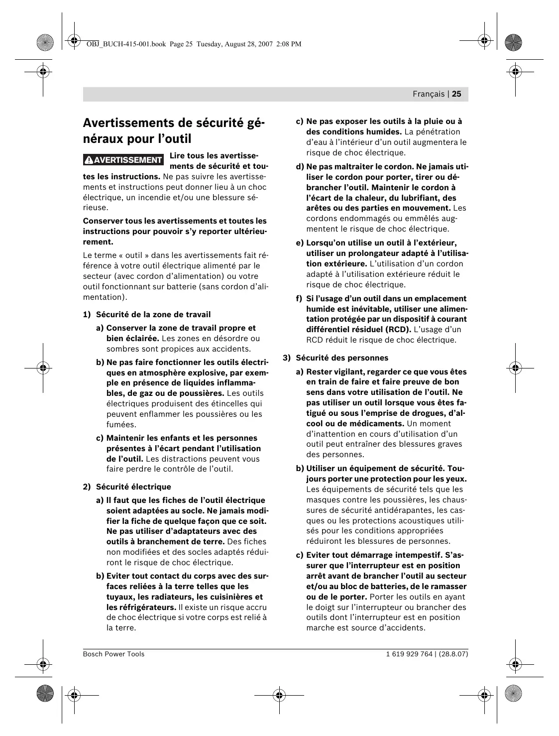 a) Rester vigilant, regarder ce que vous êtes en train de faire et faire preuve de bon sens dans votre utilisation de l’outil. Ne pas utiliser un outil lorsque vous êtes fatigué ou sous l’emprise de drogues, d’alcool ou de médicaments. Un moment d’inattention en cours d’utilisation d’un outil peut entraîner des blessures graves des personnes. b) Utiliser un équipement de sécurité. Toujours porter une protection pour les yeux. Les équipements de sécurité tels que les masques contre les poussières, les chaussures de sécurité antidérapantes, les casques ou les protections acoustiques utilisés pour les conditions appropriées réduiront les blessures de personnes. c) Eviter tout démarrage intempestif. S’assurer que l’interrupteur est en position arrêt avant de brancher l’outil au secteur et/ou au bloc de batteries, de le ramasser ou de le porter. Porter les outils en ayant le doigt sur l’interrupteur ou brancher des outils dont l’interrupteur est en position marche est source d’accidents. 1 619 929 764 | (28.8.07) 26 | Français d) Retirer toute clé de réglage avant de mettre l’outil en marche. Une clé laissée fixée sur une partie tournante de l’outil peut donner lieu à des blessures de personnes. e) Ne pas se précipiter. Garder une position et un équilibre adaptés à tout moment. Cela permet un meilleur contrôle de l’outil dans des situations inattendues. f) S’habiller de manière adaptée. Ne pas porter de vêtements amples ou de bijoux. Garder les cheveux, les vêtements et les gants à distance des parties en mouvement. Des vêtements amples, des bijoux ou les cheveux longs peuvent être pris dans des parties en mouvement. g) Si des dispositifs sont fournis pour le raccordement d’équipements pour l’extraction et la récupération des poussières, s’assurer qu’ils sont connectés et correctement utilisés. Utiliser des collecteurs de poussière peut réduire les risques dus aux poussières.