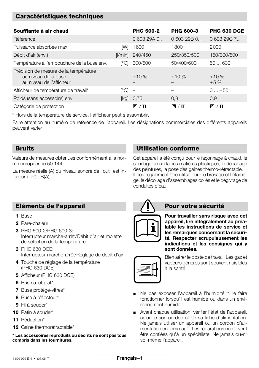 - Hors de la température de service, l’afficheur peut s’assombrir. Faire attention au numéro de référence de l’appareil. Les désignations commerciales des différents appareils peuvent varier. Utilisation conforme Bruits Valeurs de mesures obtenues conformément à la norme européenne 50 144. La mesure réelle (A) du niveau sonore de l’outil est inférieur à 70 dB(A). Cet appareil a été conçu pour le façonnage à chaud, le soudage de certaines matières plastiques, le décapage des peintures, la pose des gaines thermo-rétractable. Il peut également être utilisé pour le brasage et l’étamage, le décollage d’assemblages collés et le dégivrage de conduites d’eau. Eléments de l’appareil Pour votre sécurité 1 Buse 2 Pare-chaleur 3 PHG 500-2/PHG 600-3: Interrupteur marche-arrêt/Débit d’air et molette de sélection de la température 3 PHG 630 DCE: Interrupteur marche-arrêt/Réglage du débit d’air 4 Touche de réglage de la température (PHG 630 DCE) 5 Afficheur (PHG 630 DCE) 6 Buse à jet plat* 7 Buse protège-vitres* 8 Buse à réflecteur* 9 Fil à souder* 10 Patin à souder* 11 Réduction* 12 Gaine thermorétractable*