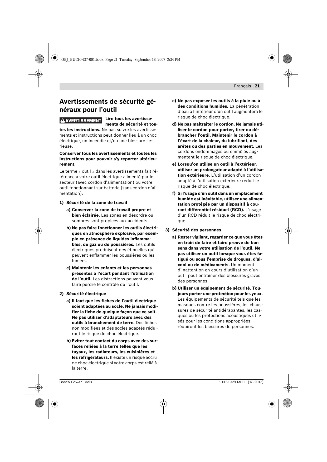 Le terme « outil » dans les avertissements fait référence à votre outil électrique alimenté par le secteur (avec cordon d'alimentation) ou à votre outil fonctionnant sur batterie (sans cordon d'alimentation).