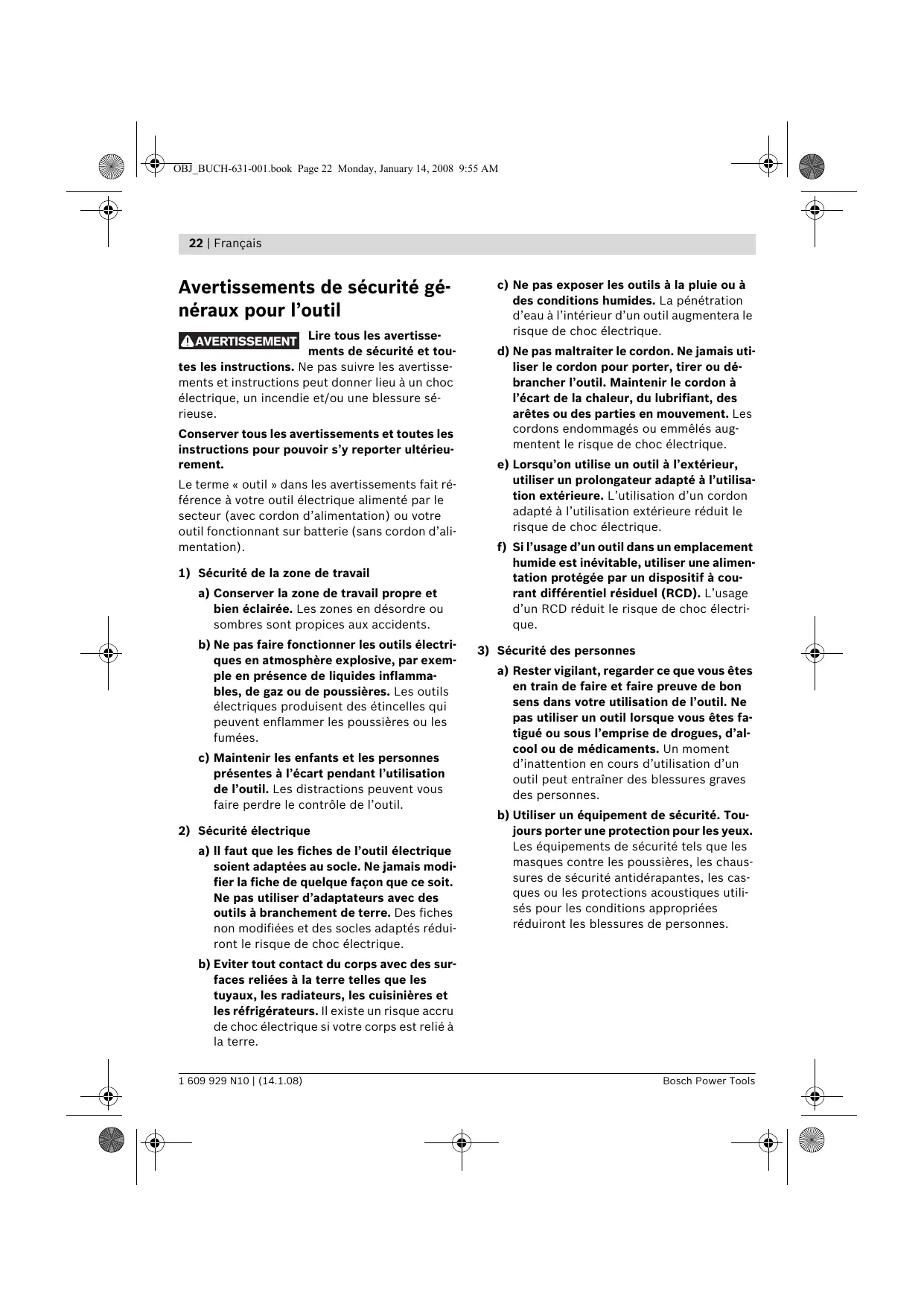 a) Rester vigilant, regarder ce que vous êtes en train de faire et faire preuve de bon sens dans votre utilisation de l’outil. Ne pas utiliser un outil lorsque vous êtes fatigué ou sous l’emprise de drogues, d’alcool ou de médicaments. Un moment d’inattention en cours d’utilisation d’un outil peut entraîner des blessures graves des personnes. b) Utiliser un équipement de sécurité. Toujours porter une protection pour les yeux. Les équipements de sécurité tels que les masques contre les poussières, les chaussures de sécurité antidérapantes, les casques ou les protections acoustiques utilisés pour les conditions appropriées réduiront les blessures de personnes. b) Eviter tout contact du corps avec des surfaces reliées à la terre telles que les tuyaux, les radiateurs, les cuisinières et les réfrigérateurs. Il existe un risque accru de choc électrique si votre corps est relié à la terre. 1 609 929 N10 | (14.1.08) Français | 23 c) Eviter tout démarrage intempestif. S’assurer que l’interrupteur est en position arrêt avant de brancher l’outil au secteur et/ou au bloc de batteries, de le ramasser ou de le porter. Porter les outils en ayant le doigt sur l’interrupteur ou brancher des outils dont l’interrupteur est en position marche est source d’accidents. d) Retirer toute clé de réglage avant de mettre l’outil en marche. Une clé laissée fixée sur une partie tournante de l’outil peut donner lieu à des blessures de personnes. e) Ne pas se précipiter. Garder une position et un équilibre adaptés à tout moment. Cela permet un meilleur contrôle de l’outil dans des situations inattendues. f) S’habiller de manière adaptée. Ne pas porter de vêtements amples ou de bijoux. Garder les cheveux, les vêtements et les gants à distance des parties en mouvement. Des vêtements amples, des bijoux ou les cheveux longs peuvent être pris dans des parties en mouvement. g) Si des dispositifs sont fournis pour le raccordement d’équipements pour l’extraction et la récupération des poussières, s’assurer qu’ils sont connectés et correctement utilisés. Utiliser des collecteurs de poussière peut réduire les risques dus aux poussières.