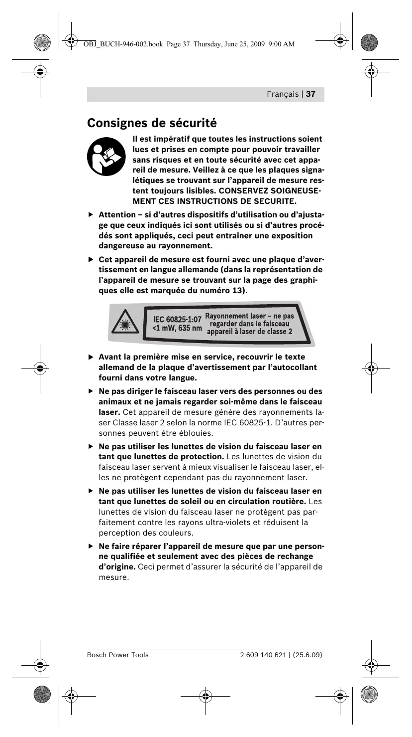 f Avant la première mise en service, recouvrir le texte allemand de la plaque d’avertissement par l’autocollant fourni dans votre langue. f Ne pas diriger le faisceau laser vers des personnes ou des animaux et ne jamais regarder soi-même dans le faisceau laser. Cet appareil de mesure génère des rayonnements laser Classe laser 2 selon la norme IEC 60825-1. D’autres personnes peuvent être éblouies. f Ne pas utiliser les lunettes de vision du faisceau laser en tant que lunettes de protection. Les lunettes de vision du faisceau laser servent à mieux visualiser le faisceau laser, elles ne protègent cependant pas du rayonnement laser. f Ne pas utiliser les lunettes de vision du faisceau laser en tant que lunettes de soleil ou en circulation routière. Les lunettes de vision du faisceau laser ne protègent pas parfaitement contre les rayons ultra-violets et réduisent la perception des couleurs. f Ne faire réparer l’appareil de mesure que par une personne qualifiée et seulement avec des pièces de rechange d’origine. Ceci permet d’assurer la sécurité de l’appareil de mesure.