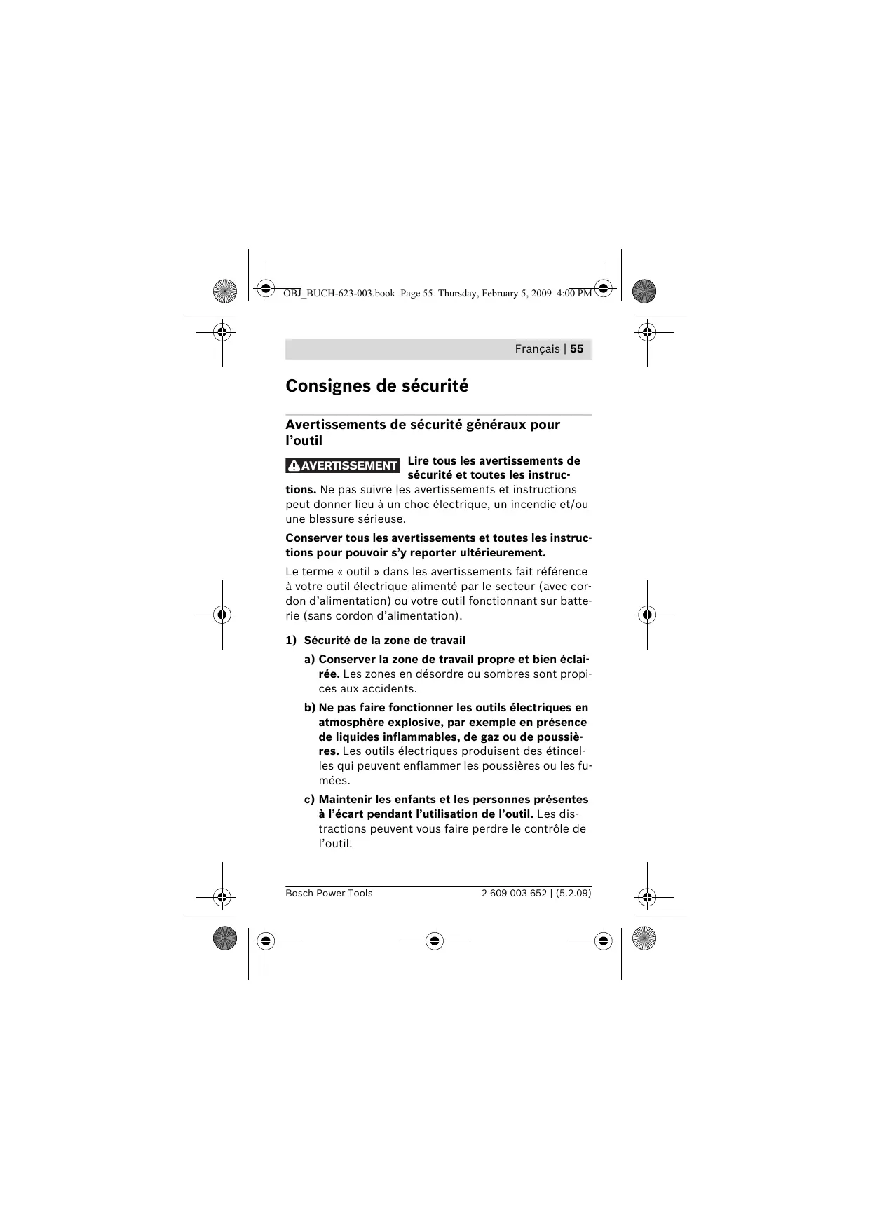 a) ll faut que les fiches de l’outil électrique soient adaptées au socle. Ne jamais modifier la fiche de quelque façon que ce soit. Ne pas utiliser d’adaptateurs avec des outils à branchement de terre. Des fiches non modifiées et des socles adaptés réduiront le risque de choc électrique. b) Eviter tout contact du corps avec des surfaces reliées à la terre telles que les tuyaux, les radiateurs, les cuisinières et les réfrigérateurs. Il existe un risque accru de choc électrique si votre corps est relié à la terre. c) Ne pas exposer les outils à la pluie ou à des conditions humides. La pénétration d’eau à l’intérieur d’un outil augmentera le risque de choc électrique. d) Ne pas maltraiter le cordon. Ne jamais utiliser le cordon pour porter, tirer ou débrancher l’outil. Maintenir le cordon à l’écart de la chaleur, du lubrifiant, des arêtes ou des parties en mouvement. Les cordons endommagés ou emmêlés augmentent le risque de choc électrique. e) Lorsqu’on utilise un outil à l’extérieur, utiliser un prolongateur adapté à l’utilisation extérieure. L’utilisation d’un cordon adapté à l’utilisation extérieure réduit le risque de choc électrique. f) Si l’usage d’un outil dans un emplacement humide est inévitable, utiliser une alimentation protégée par un dispositif à courant différentiel résiduel (RCD). L’usage d’un RCD réduit le risque de choc électrique. 2 609 003 652 | (5.2.09) Français | 57