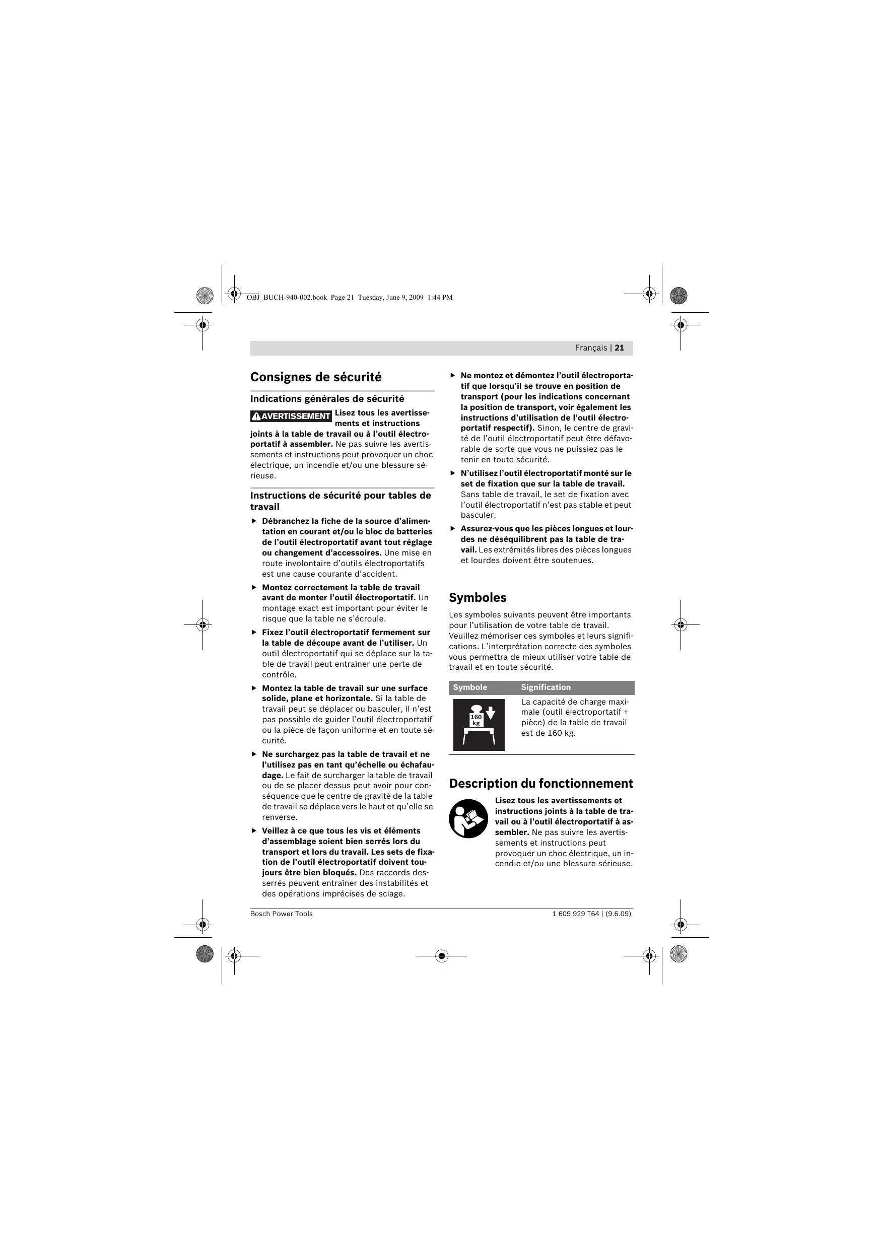Instructions de sécurité pour tables de travail f Débranchez la fiche de la source d’alimentation en courant et/ou le bloc de batteries de l’outil électroportatif avant tout réglage ou changement d’accessoires. Une mise en route involontaire d’outils électroportatifs est une cause courante d’accident. f Montez correctement la table de travail avant de monter l’outil électroportatif. Un montage exact est important pour éviter le risque que la table ne s’écroule. f Fixez l’outil électroportatif fermement sur la table de découpe avant de l’utiliser. Un outil électroportatif qui se déplace sur la table de travail peut entraîner une perte de contrôle. f Montez la table de travail sur une surface solide, plane et horizontale. Si la table de travail peut se déplacer ou basculer, il n’est pas possible de guider l’outil électroportatif ou la pièce de façon uniforme et en toute sécurité. f Ne surchargez pas la table de travail et ne l’utilisez pas en tant qu’échelle ou échafaudage. Le fait de surcharger la table de travail ou de se placer dessus peut avoir pour conséquence que le centre de gravité de la table de travail se déplace vers le haut et qu’elle se renverse. f Veillez à ce que tous les vis et éléments d’assemblage soient bien serrés lors du transport et lors du travail. Les sets de fixation de l’outil électroportatif doivent toujours être bien bloqués. Des raccords desserrés peuvent entraîner des instabilités et des opérations imprécises de sciage.