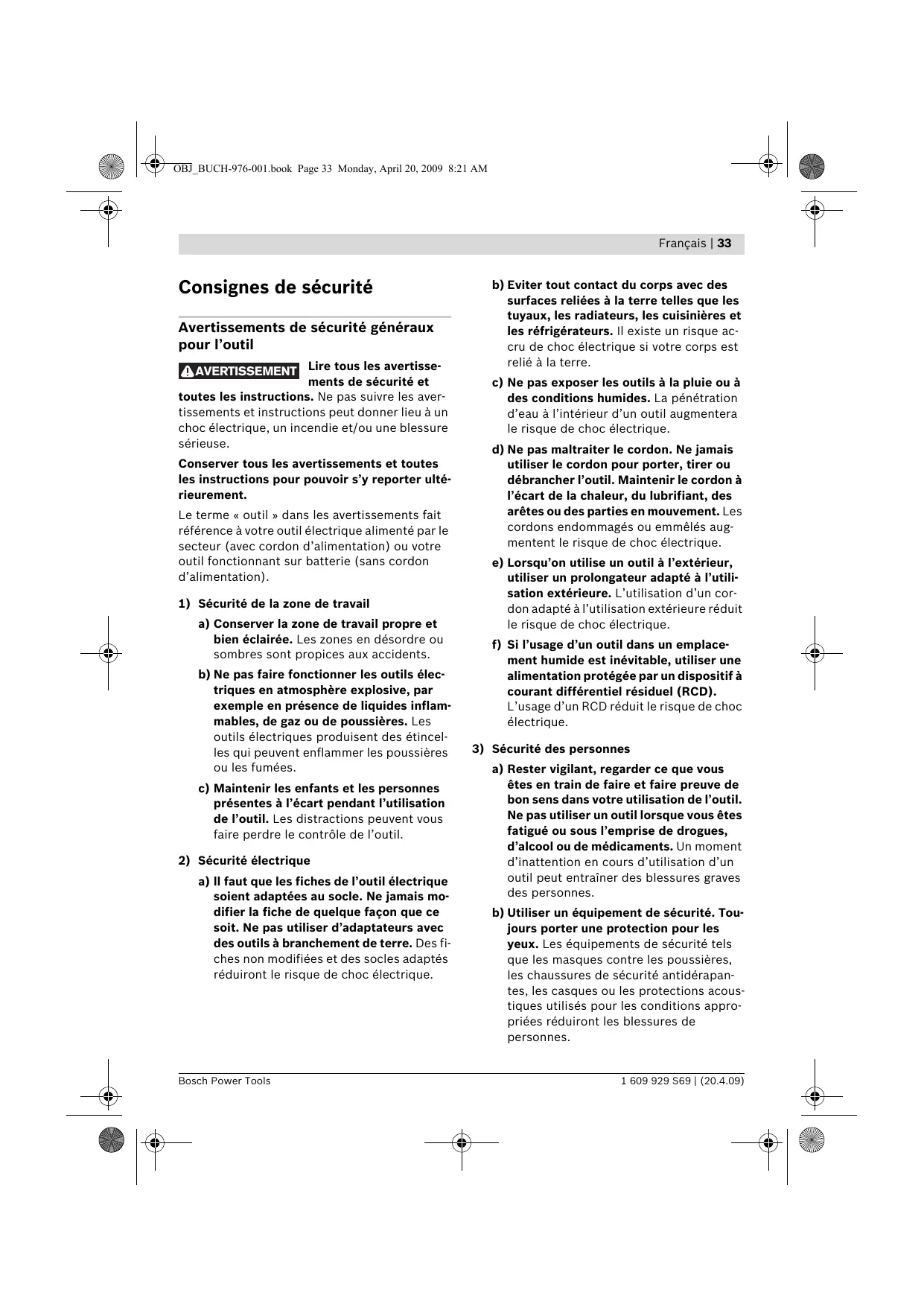 a) Rester vigilant, regarder ce que vous êtes en train de faire et faire preuve de bon sens dans votre utilisation de l’outil. Ne pas utiliser un outil lorsque vous êtes fatigué ou sous l’emprise de drogues, d’alcool ou de médicaments. Un moment d’inattention en cours d’utilisation d’un outil peut entraîner des blessures graves des personnes. b) Utiliser un équipement de sécurité. Toujours porter une protection pour les yeux. Les équipements de sécurité tels que les masques contre les poussières, les chaussures de sécurité antidérapantes, les casques ou les protections acoustiques utilisés pour les conditions appropriées réduiront les blessures de personnes. 1 609 929 S69 | (20.4.09) 34 | Français c) Eviter tout démarrage intempestif. S’assurer que l’interrupteur est en position arrêt avant de brancher l’outil au secteur et/ou au bloc de batteries, de le ramasser ou de le porter. Porter les outils en ayant le doigt sur l’interrupteur ou brancher des outils dont l’interrupteur est en position marche est source d’accidents. d) Retirer toute clé de réglage avant de mettre l’outil en marche. Une clé laissée fixée sur une partie tournante de l’outil peut donner lieu à des blessures de personnes. e) Ne pas se précipiter. Garder une position et un équilibre adaptés à tout moment. Cela permet un meilleur contrôle de l’outil dans des situations inattendues. f) S’habiller de manière adaptée. Ne pas porter de vêtements amples ou de bijoux. Garder les cheveux, les vêtements et les gants à distance des parties en mouvement. Des vêtements amples, des bijoux ou les cheveux longs peuvent être pris dans des parties en mouvement. g) Si des dispositifs sont fournis pour le raccordement d’équipements pour l’extraction et la récupération des poussières, s’assurer qu’ils sont connectés et correctement utilisés. Utiliser des collecteurs de poussière peut réduire les risques dus aux poussières.