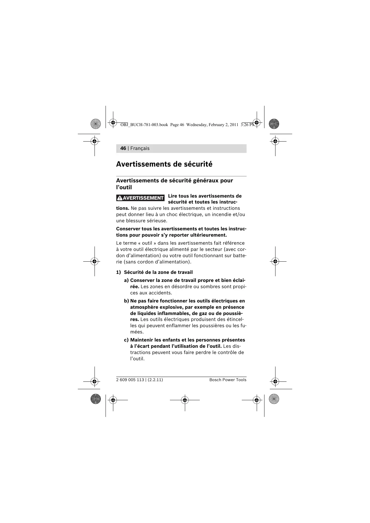 a) Conserver la zone de travail propre et bien éclairée. Les zones en désordre ou sombres sont propices aux accidents. b) Ne pas faire fonctionner les outils électriques en atmosphère explosive, par exemple en présence de liquides inflammables, de gaz ou de poussières. Les outils électriques produisent des étincelles qui peuvent enflammer les poussières ou les fumées. c) Maintenir les enfants et les personnes présentes à l’écart pendant l’utilisation de l’outil. Les distractions peuvent vous faire perdre le contrôle de l’outil. 2 609 005 113 | (2.2.11) Français | 47