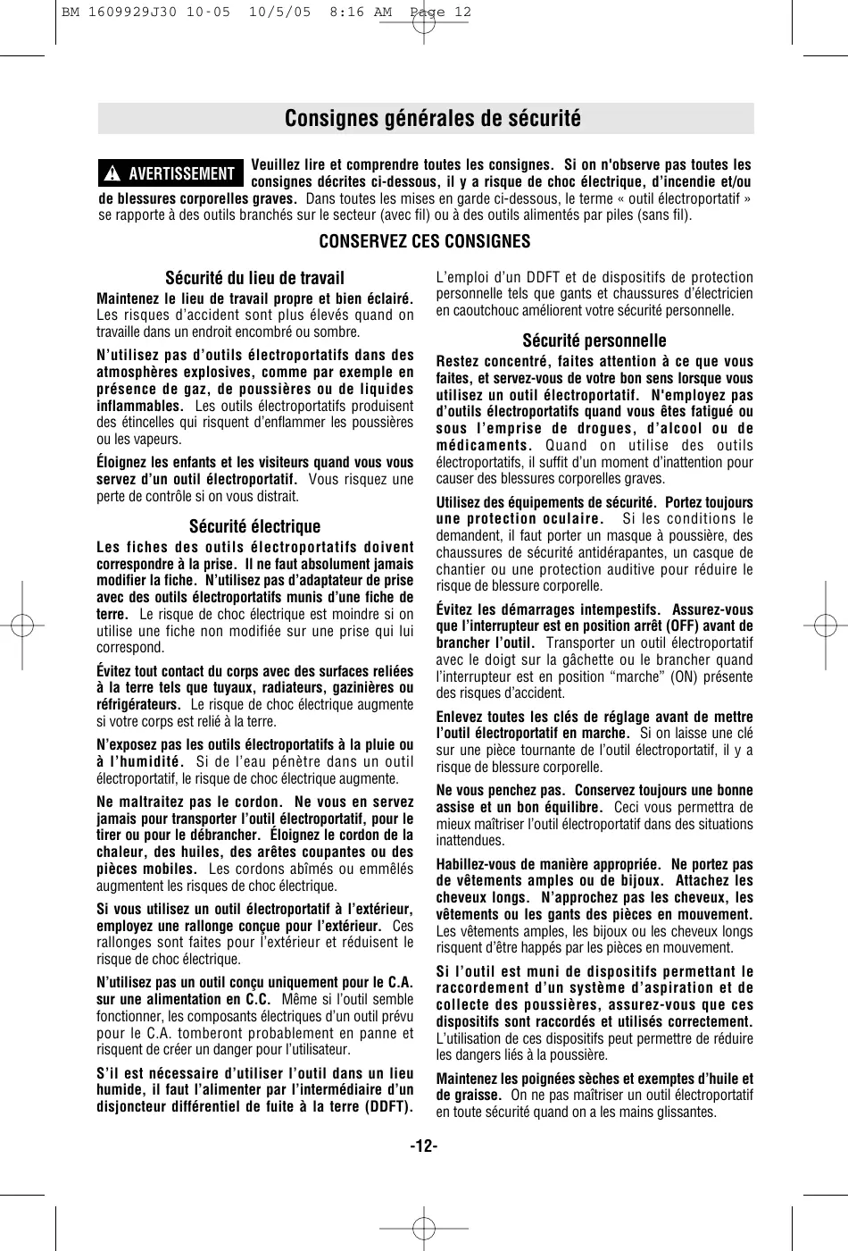 ! AVERTISSEMENT consignes décrites ci-dessous, il y a risque de choc électrique, d’incendie et/ou de blessures corporelles graves. Dans toutes les mises en garde ci-dessous, le terme « outil électroportatif » se rapporte à des outils branchés sur le secteur (avec fil) ou à des outils alimentés par piles (sans fil).