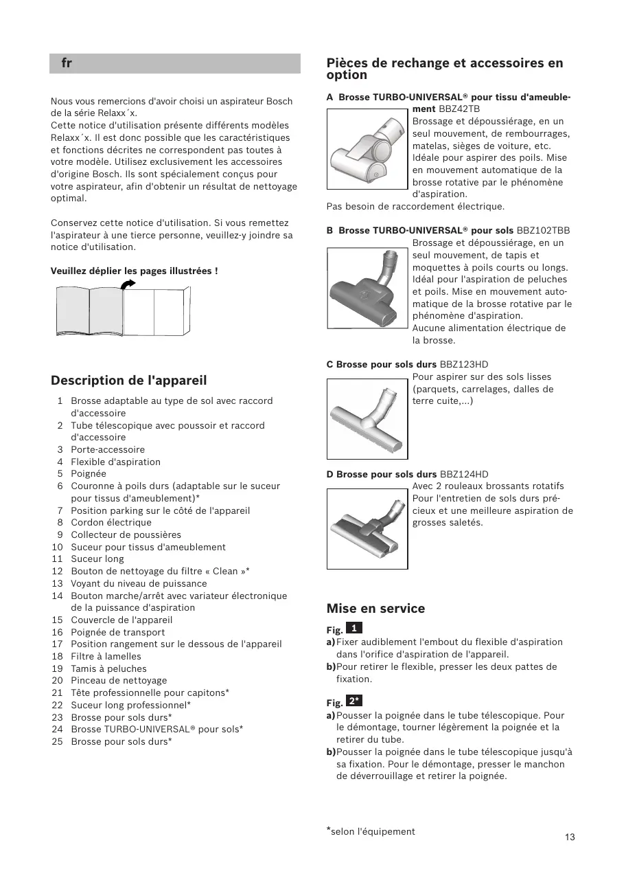 Nous vous remercions d'avoir choisi un aspirateur Bosch de la série Relaxx´x. Cette notice d'utilisation présente différents modèles Relaxx´x. Il est donc possible que les caractéristiques et fonctions décrites ne correspondent pas toutes à votre modèle. Utilisez exclusivement les accessoires d'origine Bosch. Ils sont spécialement conçus pour votre aspirateur, afin d'obtenir un résultat de nettoyage optimal. Conservez cette notice d'utilisation. Si vous remettez l'aspirateur à une tierce personne, veuillez-y joindre sa notice d'utilisation. Veuillez déplier les pages illustrées !