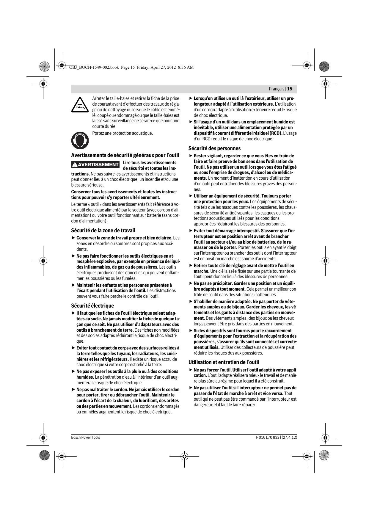 Français Avertissements de sécurité Explication des symboles Lisez soigneusement ces instructions d’utilisation. Ne pas utiliser le taille-haies par temps de pluie. Ne pas exposer le taille-haies à la pluie. Français | 15 Arrêter le taille-haies et retirer la fiche de la prise de courant avant d’effectuer des travaux de réglage ou de nettoyage ou lorsque le câble est emmêlé, coupé ou endommagé ou que le taille-haies est laissé sans surveillance ne serait-ce que pour une courte durée. Portez une protection acoustique. Avertissements de sécurité généraux pour l’outil AVERTISSEMENT Lire tous les avertissements de sécurité et toutes les instructions. Ne pas suivre les avertissements et instructions peut donner lieu à un choc électrique, un incendie et/ou une blessure sérieuse. Conserver tous les avertissements et toutes les instructions pour pouvoir s’y reporter ultérieurement. Le terme « outil » dans les avertissements fait référence à votre outil électrique alimenté par le secteur (avec cordon d’alimentation) ou votre outil fonctionnant sur batterie (sans cordon d’alimentation). Sécurité de la zone de travail f Conserver la zone de travail propre et bien éclairée. Les zones en désordre ou sombres sont propices aux accidents. f Ne pas faire fonctionner les outils électriques en atmosphère explosive, par exemple en présence de liquides inflammables, de gaz ou de poussières. Les outils électriques produisent des étincelles qui peuvent enflammer les poussières ou les fumées. f Maintenir les enfants et les personnes présentes à l’écart pendant l’utilisation de l’outil. Les distractions peuvent vous faire perdre le contrôle de l’outil. Sécurité électrique f Il faut que les fiches de l’outil électrique soient adaptées au socle. Ne jamais modifier la fiche de quelque façon que ce soit. Ne pas utiliser d’adaptateurs avec des outils à branchement de terre. Des fiches non modifiées et des socles adaptés réduiront le risque de choc électrique. f Eviter tout contact du corps avec des surfaces reliées à la terre telles que les tuyaux, les radiateurs, les cuisinières et les réfrigérateurs. Il existe un risque accru de choc électrique si votre corps est relié à la terre. f Ne pas exposer les outils à la pluie ou à des conditions humides. La pénétration d’eau à l’intérieur d’un outil augmentera le risque de choc électrique. f Ne pas maltraiter le cordon. Ne jamais utiliser le cordon pour porter, tirer ou débrancher l’outil. Maintenir le cordon à l’écart de la chaleur, du lubrifiant, des arêtes ou des parties en mouvement. Les cordons endommagés ou emmêlés augmentent le risque de choc électrique. f Lorsqu’on utilise un outil à l’extérieur, utiliser un prolongateur adapté à l’utilisation extérieure. L’utilisation d’un cordon adapté à l’utilisation extérieure réduit le risque de choc électrique. f Si l’usage d’un outil dans un emplacement humide est inévitable, utiliser une alimentation protégée par un dispositif à courant différentiel résiduel (RCD). L’usage d’un RCD réduit le risque de choc électrique. Sécurité des personnes f Rester vigilant, regarder ce que vous êtes en train de faire et faire preuve de bon sens dans l’utilisation de l’outil. Ne pas utiliser un outil lorsque vous êtes fatigué ou sous l’emprise de drogues, d’alcool ou de médicaments. Un moment d’inattention en cours d’utilisation d’un outil peut entraîner des blessures graves des personnes. f Utiliser un équipement de sécurité. Toujours porter une protection pour les yeux. Les équipements de sécurité tels que les masques contre les poussières, les chaussures de sécurité antidérapantes, les casques ou les protections acoustiques utilisés pour les conditions appropriées réduiront les blessures des personnes. f Eviter tout démarrage intempestif. S’assurer que l’interrupteur est en position arrêt avant de brancher l’outil au secteur et/ou au bloc de batteries, de le ramasser ou de le porter. Porter les outils en ayant le doigt sur l’interrupteur ou brancher des outils dont l’interrupteur est en position marche est source d’accidents. f Retirer toute clé de réglage avant de mettre l’outil en marche. Une clé laissée fixée sur une partie tournante de l’outil peut donner lieu à des blessures de personnes. f Ne pas se précipiter. Garder une position et un équilibre adaptés à tout moment. Cela permet un meilleur contrôle de l’outil dans des situations inattendues. f S’habiller de manière adaptée. Ne pas porter de vêtements amples ou de bijoux. Garder les cheveux, les vêtements et les gants à distance des parties en mouvement. Des vêtements amples, des bijoux ou les cheveux longs peuvent être pris dans des parties en mouvement. f Si des dispositifs sont fournis pour le raccordement d’équipements pour l’extraction et la récupération des poussières, s’assurer qu’ils sont connectés et correctement utilisés. Utiliser des collecteurs de poussière peut réduire les risques dus aux poussières. Utilisation et entretien de l’outil f Ne pas forcer l’outil. Utiliser l’outil adapté à votre application. L’outil adapté réalisera mieux le travail et de manière plus sûre au régime pour lequel il a été construit. f Ne pas utiliser l’outil si l’interrupteur ne permet pas de passer de l’état de marche à arrêt et vice versa. Tout outil qui ne peut pas être commandé par l’interrupteur est dangereux et il faut le faire réparer. F 016 L70 832 | (27.4.12) 16 | Français f Débrancher la fiche de la source d’alimentation en courant et/ou le bloc de batteries de l’outil avant tout réglage, changement d’accessoires ou avant de ranger l’outil. De telles mesures de sécurité préventives réduisent le risque de démarrage accidentel de l’outil. f Conserver les outils à l’arrêt hors de la port