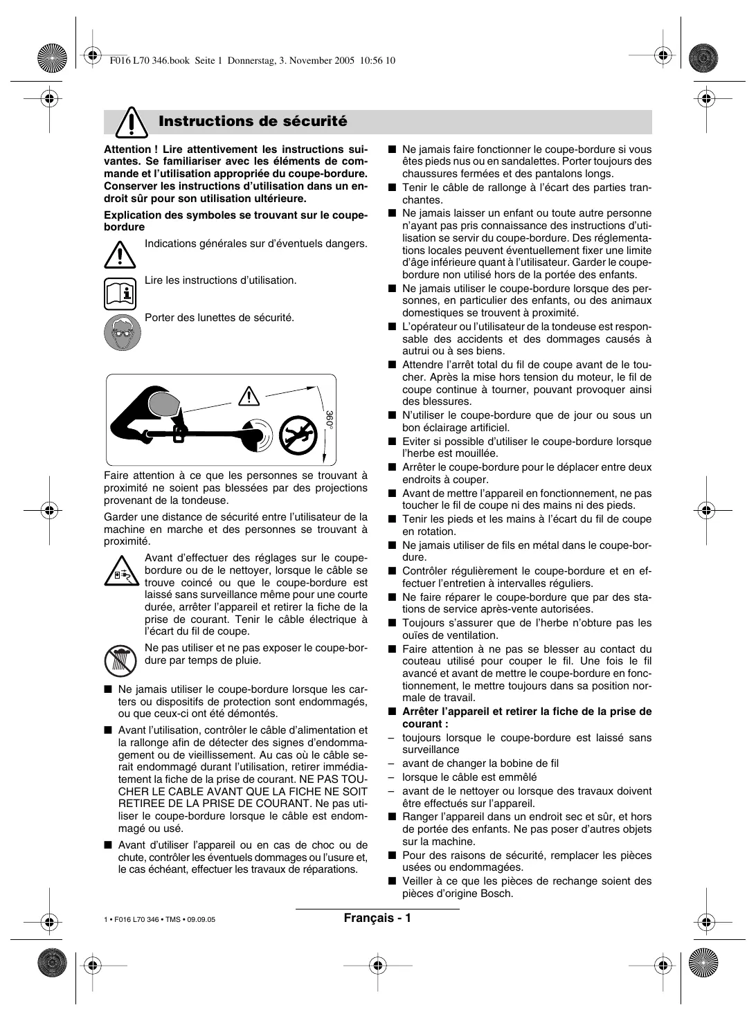 êtes pieds nus ou en sandalettes. Porter toujours des chaussures fermées et des pantalons longs. ■ Tenir le câble de rallonge à l’écart des parties tranchantes. ■ Ne jamais laisser un enfant ou toute autre personne n’ayant pas pris connaissance des instructions d’utilisation se servir du coupe-bordure. Des réglementations locales peuvent éventuellement fixer une limite d’âge inférieure quant à l’utilisateur. Garder le coupebordure non utilisé hors de la portée des enfants. ■ Ne jamais utiliser le coupe-bordure lorsque des personnes, en particulier des enfants, ou des animaux domestiques se trouvent à proximité. ■ L’opérateur ou l’utilisateur de la tondeuse est responsable des accidents et des dommages causés à autrui ou à ses biens. ■ Attendre l’arrêt total du fil de coupe avant de le toucher. Après la mise hors tension du moteur, le fil de coupe continue à tourner, pouvant provoquer ainsi des blessures. ■ N’utiliser le coupe-bordure que de jour ou sous un bon éclairage artificiel. ■ Eviter si possible d’utiliser le coupe-bordure lorsque l’herbe est mouillée. ■ Arrêter le coupe-bordure pour le déplacer entre deux endroits à couper. ■ Avant de mettre l’appareil en fonctionnement, ne pas toucher le fil de coupe ni des mains ni des pieds. ■ Tenir les pieds et les mains à l’écart du fil de coupe en rotation. ■ Ne jamais utiliser de fils en métal dans le coupe-bordure. ■ Contrôler régulièrement le coupe-bordure et en effectuer l’entretien à intervalles réguliers. ■ Ne faire réparer le coupe-bordure que par des stations de service après-vente autorisées. ■ Toujours s’assurer que de l’herbe n’obture pas les ouïes de ventilation. ■ Faire attention à ne pas se blesser au contact du couteau utilisé pour couper le fil. Une fois le fil avancé et avant de mettre le coupe-bordure en fonctionnement, le mettre toujours dans sa position normale de travail. ■ Arrêter l’appareil et retirer la fiche de la prise de courant : – toujours lorsque le coupe-bordure est laissé sans surveillance – avant de changer la bobine de fil – lorsque le câble est emmêlé – avant de le nettoyer ou lorsque des travaux doivent être effectués sur l’appareil. ■ Ranger l’appareil dans un endroit sec et sûr, et hors de portée des enfants. Ne pas poser d’autres objets sur la machine. ■ Pour des raisons de sécurité, remplacer les pièces usées ou endommagées. ■ Veiller à ce que les pièces de rechange soient des pièces d’origine Bosch.