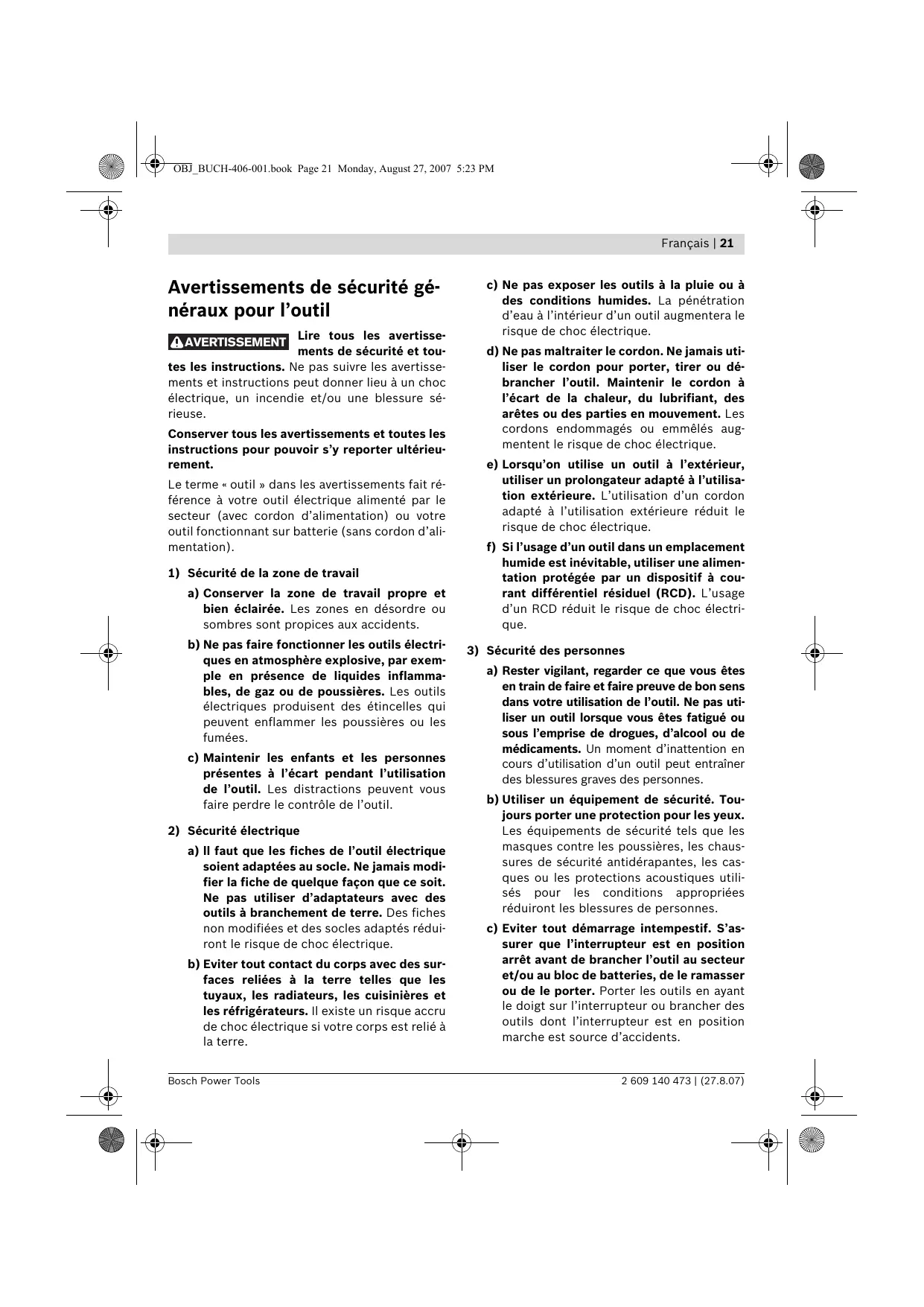 Lire tous les averissements et indications. Le non-respect des averissements et instructions indiqués ci-après peut entraîner un choc électrique, un incendie et/ou de graves blessures sur les personnes.