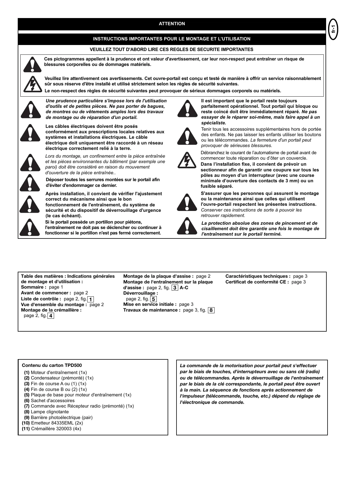 Veuillez lire attentivement ces avertissements. Cet ouvre-portail est conçu et testé de manière à offrir un service raisonnablement sûr sous réserve d'être installé et utilisé strictement selon les règles de sécurité suivantes. Le non-respect des règles de sécurité suivantes peut provoquer de sérieux dommages corporels ou matériels. Une prudence particulière s'impose lors de l'utilisation d'outils et de petites pièces. Ne pas porter de bagues, de montres ou de vêtements amples lors des travaux de montage ou de réparation d'un portail. Les câbles électriques doivent être posés conformément aux prescriptions locales relatives aux systèmes et installations électriques. Le câble électrique doit uniquement être raccordé à un réseau électrique correctement relié à la terre. Lors du montage, un confinement entre la pièce entraînée et les pièces environnantes du bâtiment (par exemple une paroi) doit être considéré en raison du mouvement d'ouverture de la pièce entraînée.. Déposer toutes les serrures montées sur le portail afin d'éviter d'endommager ce dernier. Après installation, il convient de vérifier l'ajustement correct du mécanisme ainsi que le bon fonctionnement de l'entraînement, du système de sécurité et du dispositif de déverrouillage d'urgence (le cas échéant). Si le portail possède un portillon pour piétons, l'entraînement ne doit pas se déclencher ou continuer à fonctionner si le portillon n'est pas fermé correctement.