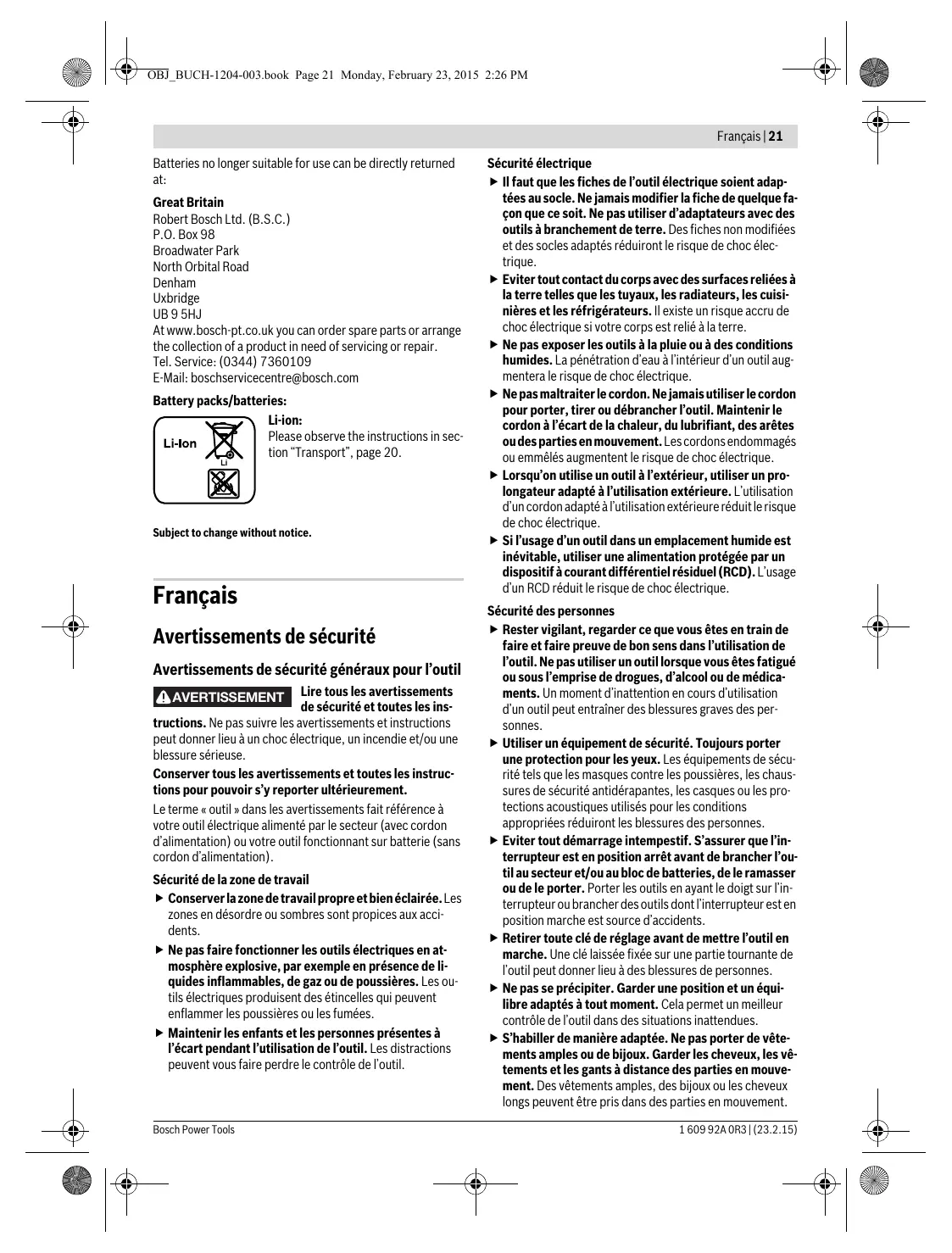 Il faut que les fiches de l’outil électrique soient adaptées au socle. Ne jamais modifier la fiche de quelque façon que ce soit. Ne pas utiliser d’adaptateurs avec des outils à branchement de terre. Des fiches non modifiées et des socles adaptés réduiront le risque de choc électrique. Eviter tout contact du corps avec des surfaces reliées à la terre telles que les tuyaux, les radiateurs, les cuisinières et les réfrigérateurs. Il existe un risque accru de choc électrique si votre corps est relié à la terre. Ne pas exposer les outils à la pluie ou à des conditions humides. La pénétration d’eau à l’intérieur d’un outil augmentera le risque de choc électrique. Ne pas maltraiter le cordon. Ne jamais utiliser le cordon pour porter, tirer ou débrancher l’outil. Maintenir le cordon à l’écart de la chaleur, du lubrifiant, des arêtes ou des parties en mouvement. Les cordons endommagés ou emmêlés augmentent le risque de choc électrique. Lorsqu’on utilise un outil à l’extérieur, utiliser un prolongateur adapté à l’utilisation extérieure. L’utilisation d’un cordon adapté à l’utilisation extérieure réduit le risque de choc électrique. Si l’usage d’un outil dans un emplacement humide est inévitable, utiliser une alimentation protégée par un dispositif à courant différentiel résiduel (RCD). L’usage d’un RCD réduit le risque de choc électrique. Sécurité des personnes Rester vigilant, regarder ce que vous êtes en train de faire et faire preuve de bon sens dans l’utilisation de l’outil. Ne pas utiliser un outil lorsque vous êtes fatigué ou sous l’emprise de drogues, d’alcool ou de médicaments. Un moment d’inattention en cours d’utilisation d’un outil peut entraîner des blessures graves des personnes. Utiliser un équipement de sécurité. Toujours porter une protection pour les yeux. Les équipements de sécurité tels que les masques contre les poussières, les chaussures de sécurité antidérapantes, les casques ou les protections acoustiques utilisés pour les conditions appropriées réduiront les blessures des personnes. Eviter tout démarrage intempestif. S’assurer que l’interrupteur est en position arrêt avant de brancher l’outil au secteur et/ou au bloc de batteries, de le ramasser ou de le porter. Porter les outils en ayant le doigt sur l’interrupteur ou brancher des outils dont l’interrupteur est en position marche est source d’accidents. Retirer toute clé de réglage avant de mettre l’outil en marche. Une clé laissée fixée sur une partie tournante de l’outil peut donner lieu à des blessures de personnes. Ne pas se précipiter. Garder une position et un équilibre adaptés à tout moment. Cela permet un meilleur contrôle de l’outil dans des situations inattendues. S’habiller de manière adaptée. Ne pas porter de vêtements amples ou de bijoux. Garder les cheveux, les vêtements et les gants à distance des parties en mouvement. Des vêtements amples, des bijoux ou les cheveux longs peuvent être pris dans des parties en mouvement. 1 609 92A 0R3 | (23.2.15)