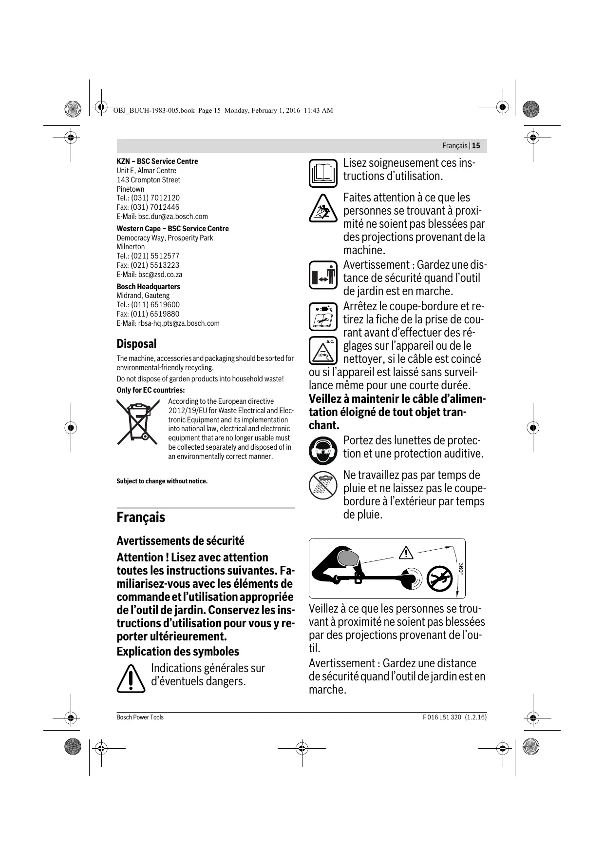 - 600 HA5 3 600 HA5 5 Nous déclarons sous notre propre responsabilité que le produit décrit sous « Caractéristiques techniques » est en conformité avec toutes les dispositions des directives 2011/65/UE, 2004/108/CE (jusqu'au 19 avril 2016), 2014/30/UE (à partir du 20 avril 2016), 2006/42/CE, 2000/14/CE et leurs modifications ainsi qu’avec les normes suivantes : EN 60335-1, EN 50636-2-91, EN 50581. 2000/14/CE : Niveau d’intensité acoustique garanti : Procédures d’évaluation de la conformité conformément à l’annexe VI. Catégorie des produits : 33 Office désigné : TÜV Rheinland Intercert Kft., Budapest, Hungary, Nr. 1008 Dossier technique (2006/42/CE, 2000/14/CE) auprès de : Bosch Lawn and Garden Ltd., PT-HG/ENS-PA2, Stowmarket, Suffolk IP14 1EY, England Henk Becker Helmut Heinzelmann Executive Vice President Head of Product Certification Engineering PT/ETM9 Montage et mise en service Une fois que le capot de protection est monté, il ne faut plus le démonter. Ne raccordez pas l’outil de jardin à la prise de courant tant qu’il n’est pas entièrement assemblé. Lorsqu’on arrête le coupe-bordure, le fil continue à tourner encore pendant quelques secondes. Attendez l’arrêt total du moteur ainsi celui du fil avant de remettre le coupe-bordure en fonctionnement. Ne pas arrêter l’appareil et le remettre en fonctionnement à de très courts intervalles. Enlevez toutes les herbes pouvant adhérer à la couverture de la bobine si vous remplacez le fil ou la bobine. Nous recommandons d’utiliser des éléments de coupe agréés par Bosch. L’utilisation d’autres éléments de coupe peut affecter la performance. Avant de mettre l’appareil en fonctionnement, contrôler si la vis de fixation du capot de protection est bien fixée. L’avance du fil de coupe s’effectue à chaque fois que la broche s’arrête (l’interrupteur Marche/Arrêt est relâché) ; un fil de coupe extra long sera coupé quand l’outil de jardin est redémarré. F 016 L81 320 | (1.2.16) dB(A) p. 3