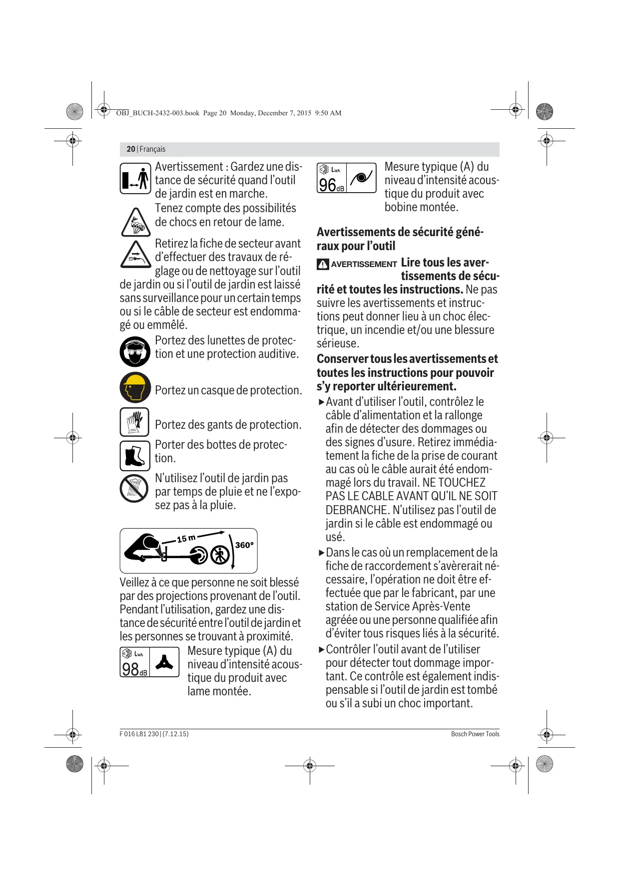 de jardin est en marche. Tenez compte des possibilités de chocs en retour de lame. Retirez la fiche de secteur avant d’effectuer des travaux de réglage ou de nettoyage sur l’outil de jardin ou si l’outil de jardin est laissé sans surveillance pour un certain temps ou si le câble de secteur est endommagé ou emmêlé. Portez des lunettes de protection et une protection auditive. Portez un casque de protection. Portez des gants de protection. Porter des bottes de protection. N’utilisez l’outil de jardin pas par temps de pluie et ne l’exposez pas à la pluie. Veillez à ce que personne ne soit blessé par des projections provenant de l’outil. Pendant l’utilisation, gardez une distance de sécurité entre l’outil de jardin et les personnes se trouvant à proximité. Mesure typique (A) du niveau d’intensité acoustique du produit avec lame montée. F 016 L81 230 | (7.12.15) Mesure typique (A) du niveau d’intensité acoustique du produit avec bobine montée. Avertissements de sécurité généraux pour l’outil AVERTISSEMENT Lire tous les avertissements de sécurité et toutes les instructions. Ne pas suivre les avertissements et instructions peut donner lieu à un choc électrique, un incendie et/ou une blessure sérieuse. Conserver tous les avertissements et toutes les instructions pour pouvoir s’y reporter ultérieurement. fAvant d’utiliser l’outil, contrôlez le câble d’alimentation et la rallonge afin de détecter des dommages ou des signes d’usure. Retirez immédiatement la fiche de la prise de courant au cas où le câble aurait été endommagé lors du travail. NE TOUCHEZ PAS LE CABLE AVANT QU’IL NE SOIT DEBRANCHE. N’utilisez pas l’outil de jardin si le câble est endommagé ou usé. fDans le cas où un remplacement de la fiche de raccordement s’avèrerait nécessaire, l’opération ne doit être effectuée que par le fabricant, par une station de Service Après-Vente agréée ou une personne qualifiée afin d’éviter tous risques liés à la sécurité. fContrôler l’outil avant de l’utiliser pour détecter tout dommage important. Ce contrôle est également indispensable si l’outil de jardin est tombé ou s’il a subi un choc important. Bosch Power Tools OBJ_BUCH-2432-003.book Page 21 Monday, December 7, 2015 9:50 AM Français | 21 fPour plus de sécurité, il est recom- mandé d’utiliser un disjoncteur différentiel avec un courant de défaut de 30 mA maximum. Avant chaque utilisation de la machine, contrôlez ce disjoncteur différentiel. fVeillez à ce que les orifices de ventilation ne soient pas obstrués par des restes. Mode d’emploi fLors du montage de l’outil de jardin, respectez les illustrations ; le démontage se fait dans l’ordre inverse. fAvant l’utilisation, retirez la protection de la lame. fN’utilisez pas l’outil de jardin pour découper des murs. fNe laissez jamais un enfant ou une autre personne n’ayant pas pris connaissance des instructions d’utilisation se servir de l’outil de jardin. Il est possible que les réglementations locales fixent une limite d’âge minimum de l’utilisateur. Gardez l’outil de jardin non utilisé hors de la portée des enfants. fCet outil de jardin doit être utilisé par des personnes disposant des capacités physiques adaptées et de l’expérience et/ou des connaissances nécessaires. Si tel n’était pas le cas ou en cas d’utilisation de cet outil par des enfants, cette utilisation ne sera possible que sous la surveillance d’une personne responsable de la sécurité des utilisateurs ou que ces derniers aient été instruits quant au maniement de l’outil. Dans le cas Bosch Power Tools contraire, un risque de mauvaise utilisation et de blessures existe. Les enfants doivent etre surveilles pour assurer qu’ils ne jouent pas avec l’outil de jardin. fN’utilisez jamais l’outil de jardin lorsque des personnes, en particulier des enfants ou des animaux domestiques, se trouvent à proximité. fL’opérateur ou l’utilisateur de la tondeuse est responsable des accidents et des dommages causés à autrui ou à ses biens. fPortez des pantalons longs, épais, des chaussures solides et des gants. Ne portez pas de vêtements amples, bijoux, pantalons courts, sandales et ne travaillez pas nu-pied. fInspectez soigneusement la surface à travailler et éliminez pierres, bâtons, fils métalliques, os et autres objets étrangers. fN’utilisez pas l’outil de jardin aux endroits où se trouvent des câbles de secteur. fAvant de mettre l’outil en fonctionnement, contrôlez toujours si la lame ou l’écrou de lame sont usés ou endommagés. Remplacez les lames usées ou endommagées toujours en même temps que les écrous de lame pour éviter tout balourd. fNe travaillez que de jour ou sous un bon éclairage artificiel. fNe pas travailler avec l’outil de jardin dans des conditions météorologiques défavorables et plus particulièrement en cas d’approche d’orage. F 016 L81 230 | (7.12.15) OBJ_BUCH-2432-003.book Page 22 Monday, December 7, 2015 9:50 AM 22 | Français fSoyez vigilant quand vous utilisez l’outil de jardin dans des herbes/arbustes humides. fVeillez à toujours garder une position stable quand vous utilisez l’outil de jardin; marcher normalement, ne jamais courir. fVeillez à toujours garder une position stable et un bon équilibre. Ne pas surestimer vos capacités. fPortez une protection auditive et des lunettes de protection lorsque vous utilisez l’outil de jardin. fPortez des lunettes de protection conformément à la norme EN 166 et une protection auditive, si vous travaillez avec l’outil de jardin. fN’utilisez jamais l’outil de jardin sans ou avec un capot de protection, dispositif de protection anti-retour ou couvercles défectueux. fN’utilisez pas l’outil de jardin avec lame à proximité de câbles de réseau/ de rallonge. fAvant et après chaque utilisation, contrôlez l’outil de jardin pour détecter des usure