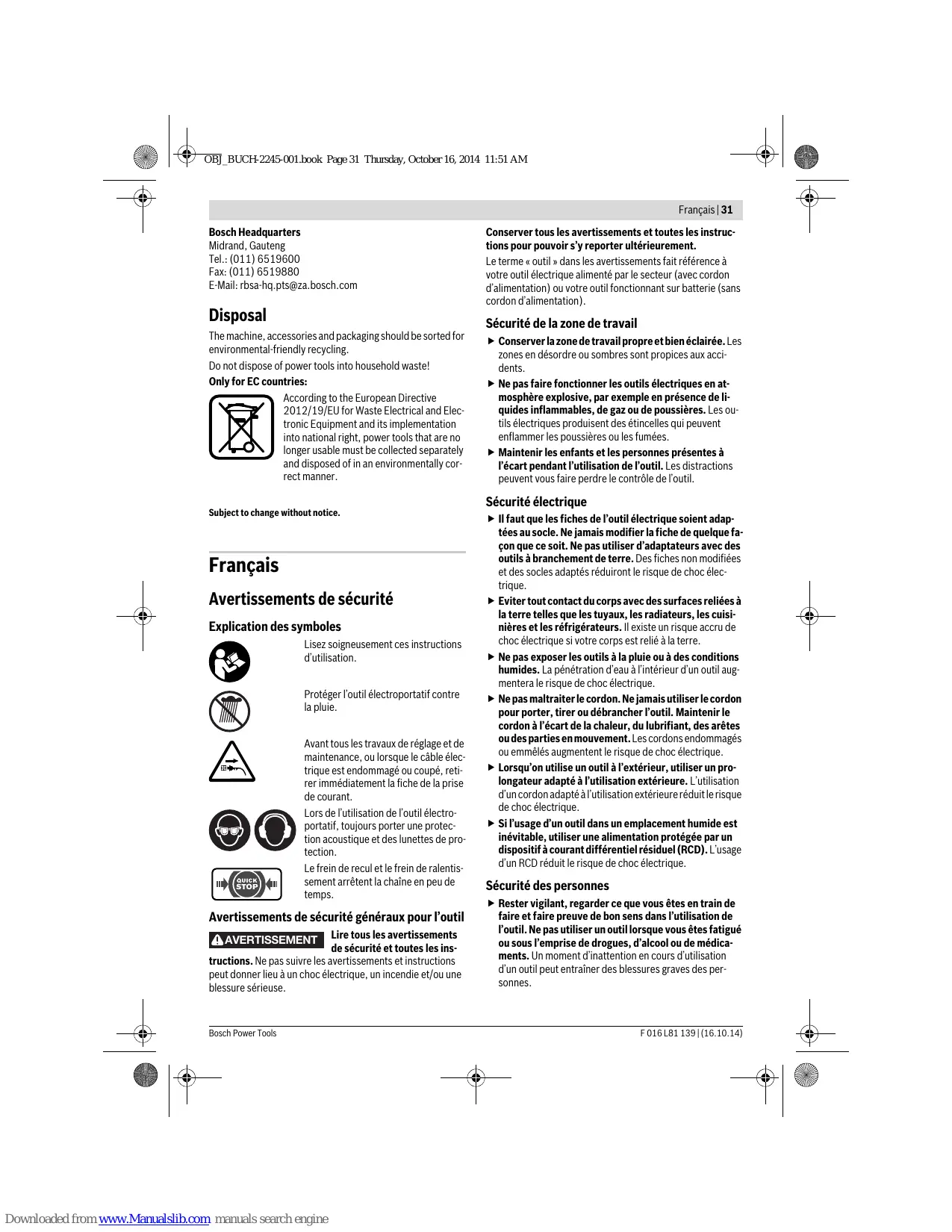 Les outils électroportatifs, ainsi que leurs accessoires et emballages, doivent pouvoir suivre chacun une voie de recyclage appropriée. Ne jetez pas les outils électroportatifs avec les ordures ménagères ! F 016 L81 139 | (16.10.14)