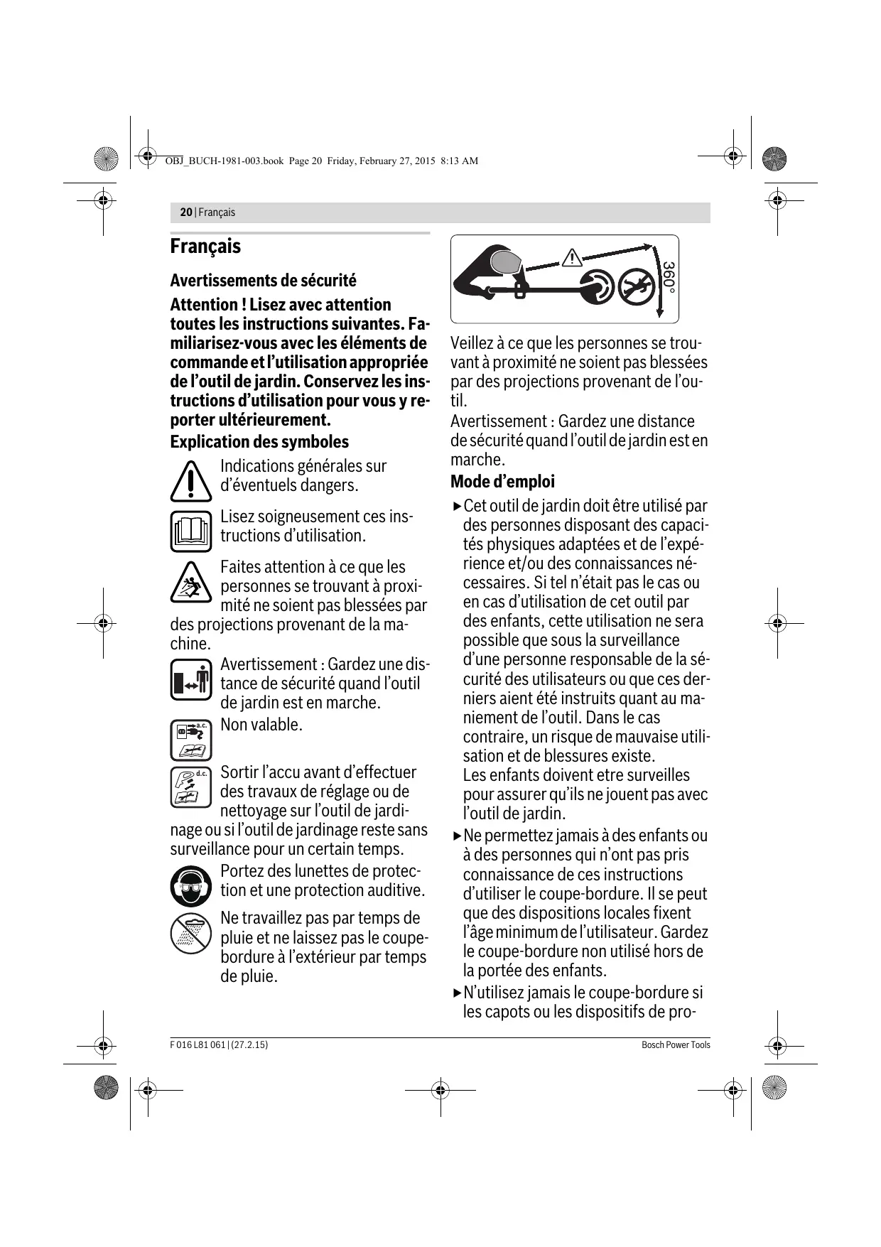 Avertissement : Gardez une distance de sécurité quand l’outil de jardin est en marche. Mode d’emploi Cet outil de jardin doit être utilisé par des personnes disposant des capacités physiques adaptées et de l’expérience et/ou des connaissances nécessaires. Si tel n’était pas le cas ou en cas d’utilisation de cet outil par des enfants, cette utilisation ne sera possible que sous la surveillance d’une personne responsable de la sécurité des utilisateurs ou que ces derniers aient été instruits quant au maniement de l’outil. Dans le cas contraire, un risque de mauvaise utilisation et de blessures existe. Les enfants doivent etre surveilles pour assurer qu’ils ne jouent pas avec l’outil de jardin. Ne permettez jamais à des enfants ou à des personnes qui n’ont pas pris connaissance de ces instructions d’utiliser le coupe-bordure. Il se peut que des dispositions locales fixent l’âge minimum de l’utilisateur. Gardez le coupe-bordure non utilisé hors de la portée des enfants. N’utilisez jamais le coupe-bordure si les capots ou les dispositifs de proBosch Power Tools