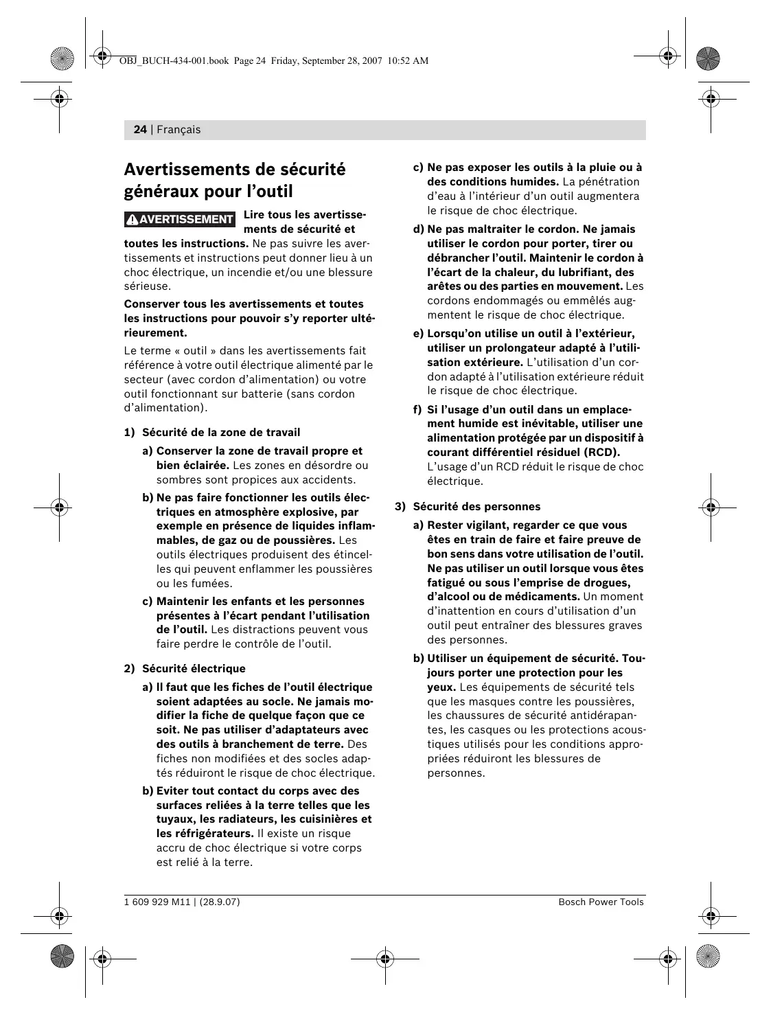 Conserver tous les avertissements et toutes les instructions pour pouvoir s’y reporter ultérieurement. Le terme « outil » dans les avertissements fait référence à votre outil électrique alimenté par le secteur (avec cordon d’alimentation) ou votre outil fonctionnant sur batterie (sans cordon d’alimentation). 1) Sécurité de la zone de travail a) Conserver la zone de travail propre et bien éclairée. Les zones en désordre ou sombres sont propices aux accidents. b) Ne pas faire fonctionner les outils électriques en atmosphère explosive, par exemple en présence de liquides inflammables, de gaz ou de poussières. Les outils électriques produisent des étincelles qui peuvent enflammer les poussières ou les fumées. c) Maintenir les enfants et les personnes présentes à l’écart pendant l’utilisation de l’outil. Les distractions peuvent vous faire perdre le contrôle de l’outil. 2) Sécurité électrique a) ll faut que les fiches de l’outil électrique soient adaptées au socle. Ne jamais modifier la fiche de quelque façon que ce soit. Ne pas utiliser d’adaptateurs avec des outils à branchement de terre. Des fiches non modifiées et des socles adaptés réduiront le risque de choc électrique.