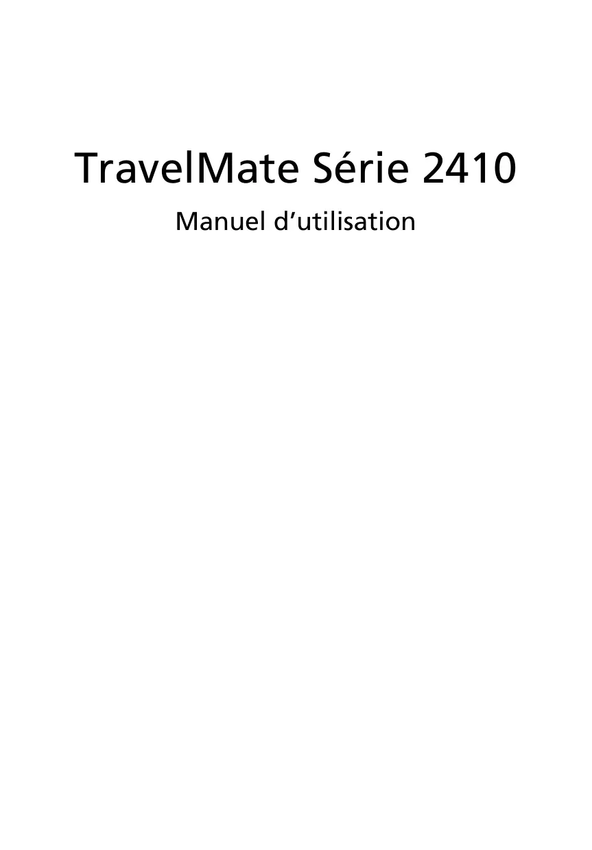 TravelMate Série 2410 Manuel d’utilisation Droits d’auteur © 2005. Acer Incorporated. Tous Droits Réservés. Manuel d’utilisation du TravelMate Série 2410 Première édition : Juillet 2005 Des modifications peuvent être apportées de temps à autre aux informations contenues dans cette publication sans obligation d’en notifier qui que ce soit. Ces modifications seront ajoutées aux nouvelles éditions de ce manuel ou dans des documents et publications complémentaires. Cette société ne fournit aucune espèce de garantie expresse ou implicite, relative à aucune des informations contenues dans ce manuel et n’offre notamment aucune garantie d’aucune sorte quant à la valeur marchande de ce produit ou son adéquation à une application particulière. Enregistrez le numéro de série, la date d’achat, et le numéro du modèle dans l’espace prévu cidessous. Le numéro de série et le numéro de modèle sont imprimés sur l’étiquette collée sur le châssis. Toutes les correspondances concernant cette unité doivent inclure ces informations. Toute reproduction, mise en mémoire de ce manuel sur un support quelconque, ainsi que toute transmission, par quelque procédé que ce soit, de manière électronique ou mécanique, par photocopie ou enregitrement et autres sont interdites sans l’autorisation écrite préalable d’Acer Incorporated. Ordinateur Notebook TravelMate Série 2410 Modèle : __________________________________________ No. de série : ______________________________________ Date d’achat : _____________________________________ Lieu d’achat : ______________________________________ Acer et le logo Acer sont des marques déposées de Acer Incorporated. Toutes les autres marques et marques déposées ne sont utilisées ici que pour un but d’identification et sont la propriété de leurs sociétés respectives. iii Nous désirons vous remercier d’avoir fait de cet ordinateur notebook de la gamme TravelMate votre choix pour répondre à vos besoins informatiques mobiles. Vos guides Pour vous aider à utiliser votre TravelMate, nous avons conçu plusieurs guides : Tout d’abord, le poster Pour partir du bon pied... vous aide à configurer votre ordinateur. Le Manuel d’utilisation imprimé présente les fonctionnalités et fonctions de base de votre ordinateur. Pour plus d’information sur l’aide que peut vous apporter pour être plus productif, veuillez vous reporter au AcerSystem User's Guide. Ce guide contient des informations détaillées sur des sujets tels que les utilitaires systèmes, la récupération des données, les options d’extension et le dépannage. De plus, il contient des informations de garantie et les réglementations générales et les avis de sécurité pour votre notebook. Il est disponible au format PDF (Portable Document Format) et est préchargé sur votre notebook. Procédez comme suit pour y accéder : 1 Cliquez sur Démarrer, Tous les programmes, puis AcerSystem. 2 Cliquez sur AcerSystem User’s Guide. Remarque : L’affichage du fichier nécessite l’installation de Adobe Acrobat Reader. Si Adobe Acrobat Reader n’est pas installé dans votre ordinateur, le clic sur AcerSystem User’s Guide va exécuter le programme d’installation d’Acrobat Reader. Suivez les instructions à l’écran pour terminer l’installation. Pour des instructions sur l’utilisation de Adobe Acrobat Reader, accédez à son menu d’Help and Support. Conseils élémentaires de soin et d’utilisation de votre ordinateur Mise sous tension et hors tension de l’ordinateur Pour mettre votre ordinateur sous tension, appuyez simplement et relâchez le bouton d’alimentation au-dessous de l’écran LCD à côté des touches de lancement facile. Voir « Vue frontale » à la page 1 pour l’emplacement de le bouton d’alimentation. Français Pour commencer Français