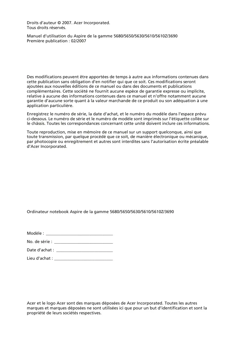 Droits d'auteur © 2007. Acer Incorporated. Tous droits réservés.