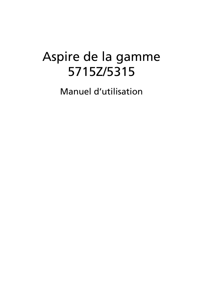 Aspire de la gamme 5715Z/5315 Manuel d’utilisation Droits d’auteur © 2007. Acer Incorporated. Tous droits réservés. Manuel d’utilisation du Aspire de la gamme 5715Z/5315 Première publication : 08/2007 Des modifications peuvent être apportées de temps à autre aux informations contenues dans cette publication sans obligation d’en notifier qui que ce soit. Ces modifications seront ajoutées aux nouvelles éditions de ce manuel ou dans des documents et publications complémentaires. Cette société ne fournit aucune espèce de garantie expresse ou implicite, relative à aucune des informations contenues dans ce manuel et n’offre notamment aucune garantie d’aucune sorte quant à la valeur marchande de ce produit ou son adéquation à une application particulière. Enregistrez le numéro de série, la date d’achat, et le numéro du modèle dans l’espace prévu ci-dessous. Le numéro de série et le numéro de modèle sont imprimés sur l’étiquette collée sur le châssis. Toutes les correspondances concernant cette unité doivent inclure ces informations. Toute reproduction, mise en mémoire de ce manuel sur un support quelconque, ainsi que toute transmission, par quelque procédé que ce soit, de manière électronique ou mécanique, par photocopie ou enregitrement et autres sont interdites sans l’autorisation écrite préalable d’Acer Incorporated. Ordinateur notebook Aspire de la gamme 5715Z/5315 Modèle : ________________________________ No. de série : ____________________________ Date d’achat : ___________________________ Lieu d’achat : ____________________________ Acer et le logo Acer sont des marques déposées de Acer Incorporated. Toutes les autres marques et marques déposées ne sont utilisées ici que pour un but d’identification et sont la propriété de leurs sociétés respectives. iii Informations pour votre sécurité et votre confort Consignes de sécurité Lisez ces instructions avec attention. Conservez ce document pour des références futures. Conformez-vous aux consignes et avertissements indiqués sur cet appareil. Mise hors tension de l’appareil avant le nettoyage Débranchez l’alimentation secteur avant tout nettoyage. N’utilisez pas de liquide ou d’aérosol de nettoyage. Utilisez un chiffon, légèrement humecté d’eau pour le nettoyage. MISE EN GARDE pour la prise comme moyen de déconnexion Respectez les instructions suivantes lors de la connexion et la déconnexion de l’alimentation de l’unité d’alimentation : Installez l’unité d’alimentation avant de connecter le cordon d’alimentation à la prise secteur. Débranchez le cordon d’alimentation avant de retirer l’unité d’alimentation de l’ordinateur. Si le système a plusieurs sources d’alimentation, déconnectez l’alimentation du système en débranchant tous les cordons d’alimentation des unités d’alimentation. MISE EN GARDE pour l’accessibilité Assurez-vous que la prise secteur à laquelle vous branchez le cordon d’alimentation est facilement accessible et située aussi proche que possible de l’utilisateur de l’équipement. Lorsque vous devez déconnecter l’alimentation de l’équipement, assurez-vous de toujours débrancher le cordon d’alimentation de la prise secteur. MISE EN GARDE pour cartes factices de connecteurs PCMCIA et Express Votre ordinateur est livré avec des cartes factices en plastique installées dans les connecteurs PCMCIA et Express. Celles-ci protègent les connecteurs non utilisés de la poussière, des objets métalliques et d’autres particules. Conservez la carte factice pour utilisation lorsqu’une carte PCMCIA ou Express n’est pas installée dans le connecteur.