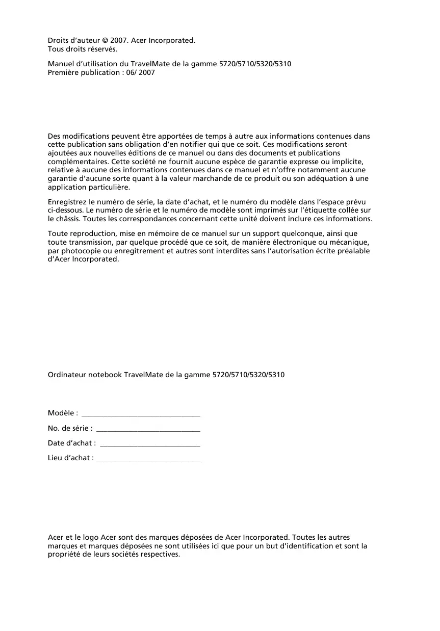 TravelMate de la gamme 5720/5710/5320/5310 Manuel d’utilisation Droits d’auteur © 2007. Acer Incorporated. Tous droits réservés. Manuel d’utilisation du TravelMate de la gamme 5720/5710/5320/5310 Première publication : 06/ 2007 Des modifications peuvent être apportées de temps à autre aux informations contenues dans cette publication sans obligation d’en notifier qui que ce soit. Ces modifications seront ajoutées aux nouvelles éditions de ce manuel ou dans des documents et publications complémentaires. Cette société ne fournit aucune espèce de garantie expresse ou implicite, relative à aucune des informations contenues dans ce manuel et n’offre notamment aucune garantie d’aucune sorte quant à la valeur marchande de ce produit ou son adéquation à une application particulière. Enregistrez le numéro de série, la date d’achat, et le numéro du modèle dans l’espace prévu ci-dessous. Le numéro de série et le numéro de modèle sont imprimés sur l’étiquette collée sur le châssis. Toutes les correspondances concernant cette unité doivent inclure ces informations. Toute reproduction, mise en mémoire de ce manuel sur un support quelconque, ainsi que toute transmission, par quelque procédé que ce soit, de manière électronique ou mécanique, par photocopie ou enregitrement et autres sont interdites sans l’autorisation écrite préalable d’Acer Incorporated. Ordinateur notebook TravelMate de la gamme 5720/5710/5320/5310 Modèle : ________________________________ No. de série : ____________________________ Date d’achat : ___________________________ Lieu d’achat : ____________________________ Acer et le logo Acer sont des marques déposées de Acer Incorporated. Toutes les autres marques et marques déposées ne sont utilisées ici que pour un but d’identification et sont la propriété de leurs sociétés respectives. iii Informations pour votre sécurité et votre confort Consignes de sécurité Lisez ces instructions avec attention. Conservez ce document pour des références futures. Conformez-vous aux consignes et avertissements indiqués sur cet appareil. Mise hors tension de l’appareil avant le nettoyage Débranchez l’alimentation secteur avant tout nettoyage. N’utilisez pas de liquide ou d’aérosol de nettoyage. Utilisez un chiffon, légèrement humecté d’eau pour le nettoyage. MISE EN GARDE pour la prise comme moyen de déconnexion Respectez les instructions suivantes lors de la connexion et la déconnexion de l’alimentation de l’unité d’alimentation : Installez l’unité d’alimentation avant de connecter le cordon d’alimentation à la prise secteur. Débranchez le cordon d’alimentation avant de retirer l’unité d’alimentation de l’ordinateur. Si le système a plusieurs sources d’alimentation, déconnectez l’alimentation du système en débranchant tous les cordons d’alimentation des unités d’alimentation. MISE EN GARDE pour l’accessibilité Assurez-vous que la prise secteur à laquelle vous branchez le cordon d’alimentation est facilement accessible et située aussi proche que possible de l’utilisateur de l’équipement. Lorsque vous devez déconnecter l’alimentation de l’équipement, assurez-vous de toujours débrancher le cordon d’alimentation de la prise secteur. MISE EN GARDE pour cartes factices de connecteurs PCMCIA et Express Votre ordinateur est livré avec des cartes factices en plastique installées dans les connecteurs PCMCIA et Express. Celles-ci protègent les connecteurs non utilisés de la poussière, des objets métalliques et d’autres particules. Conservez la carte factice pour utilisation lorsqu’une carte PCMCIA ou Express n’est pas installée dans le connecteur.