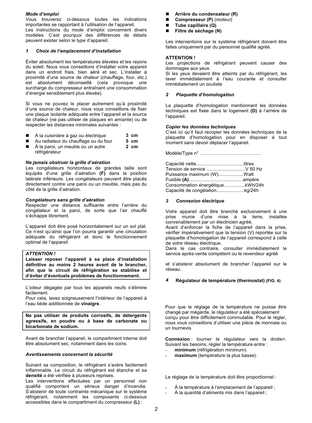 Arrière du condensateur (R) Compresseur (P) (moteur) Tube capillaire (Q) Filtre de séchage (N) Mode d’emploi Vous trouverez ci-dessous toutes les indications importantes se rapportant à l’utilisation de l’appareil. Les instructions du mode d’emploi concernent divers modèles. C’est pourquoi des différences de détails peuvent exister selon le type d’appareil.