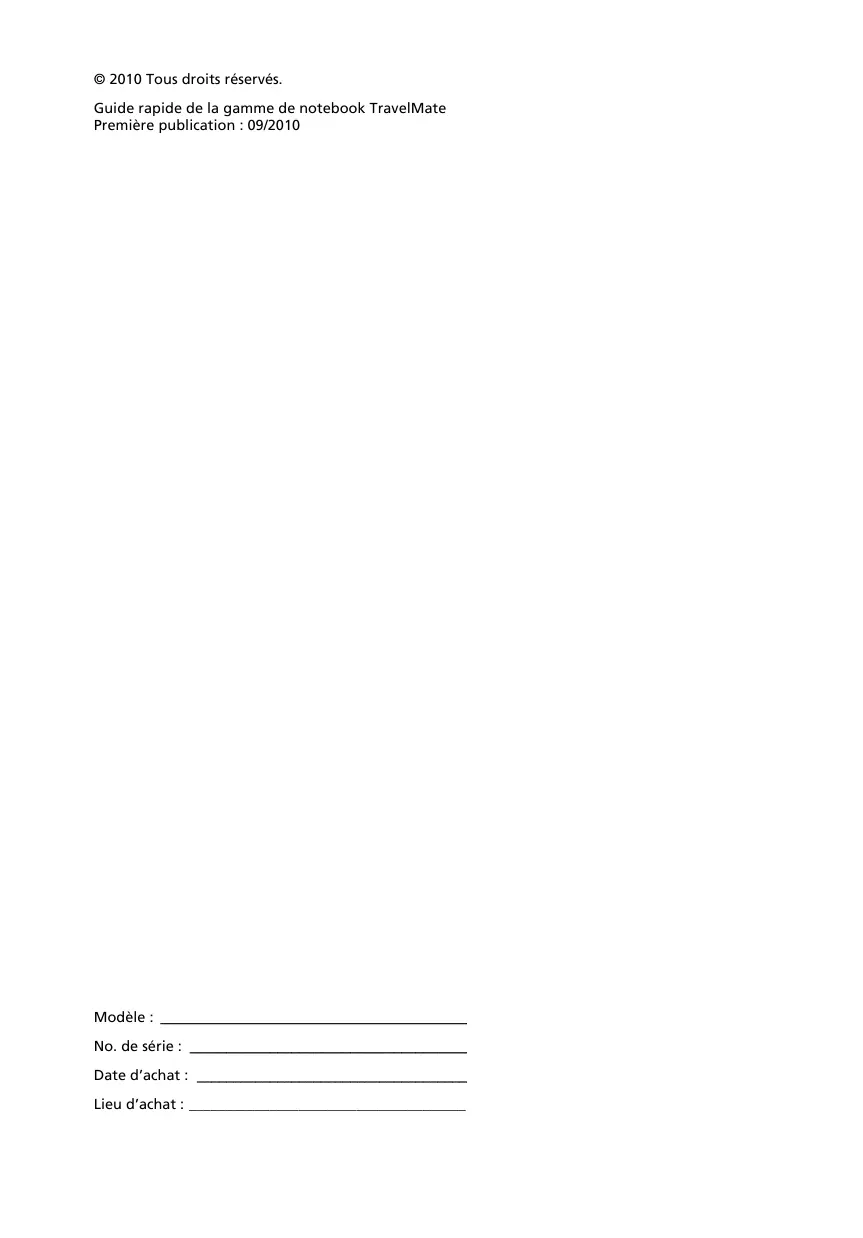 Le Guide Utilisateur Générique de la gamme TravelMate contient des informations utiles qui s'appliquent à tous les modèles de la gamme des produits TravelMate. Il couvre les notions de base, telles que l'utilisation du clavier et du son, etc. Merci de comprendre que par sa nature, le AcerSystem User Guide mentionné ci-dessous fera parfois réference à des fonctions ou des caractéristiques qui ne sont pourvues que chez certains modèles de la gamme, mais pas nécessairement dans le modele que vous avez acheté. Ces cas sont marqués dans le texte avec des mentions telles que « seulement pour certains modèles »