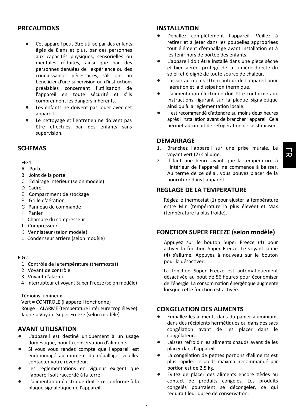 Réglez le thermostat (1) pour ajuster la température entre Min (température la plus élevée) et Max (température la plus froide). FONCTION SUPER FREEZE (selon modèle) Appuyez sur le bouton Super Freeze (4) pour activer la fonction Super Freeze. Le voyant jaune (4) s'allume. Appuyez à nouveau sur le bouton pour la désactiver. FIG2. 1 Contrôle de la température (thermostat) 2 Voyant de contrôle 3 Voyant d'alarme 4 Interrupteur et voyant Super Freeze (selon modèle) La fonction Super Freeze est automatiquement désactivée au bout de 56 heures pour économiser de l'énergie. La consommation énergétique augmente lorsque cette fonction est activée. Témoins lumineux Vert = CONTROLE (l'appareil fonctionne) Rouge = ALARME (température intérieure trop élevée) Jaune = Voyant Super Freeze (selon modèle) Branchez l'appareil sur une prise murale. Le voyant vert (2) s'allume. Il faut une heure avant que la température à l'intérieur de l'appareil ne commence à baisser. Au terme de ce délai, vous pouvez placer de la nourriture dans l'appareil. L'appareil est destiné uniquement à un usage domestique, pour la conservation d'aliments. Si vous vous rendez compte que l'appareil est endommagé au moment du déballage, veuillez contacter votre revendeur. Les réglementations en vigueur exigent que l'appareil soit raccordé à la terre. L'alimentation électrique doit être conforme à la plaque signalétique de l'appareil.