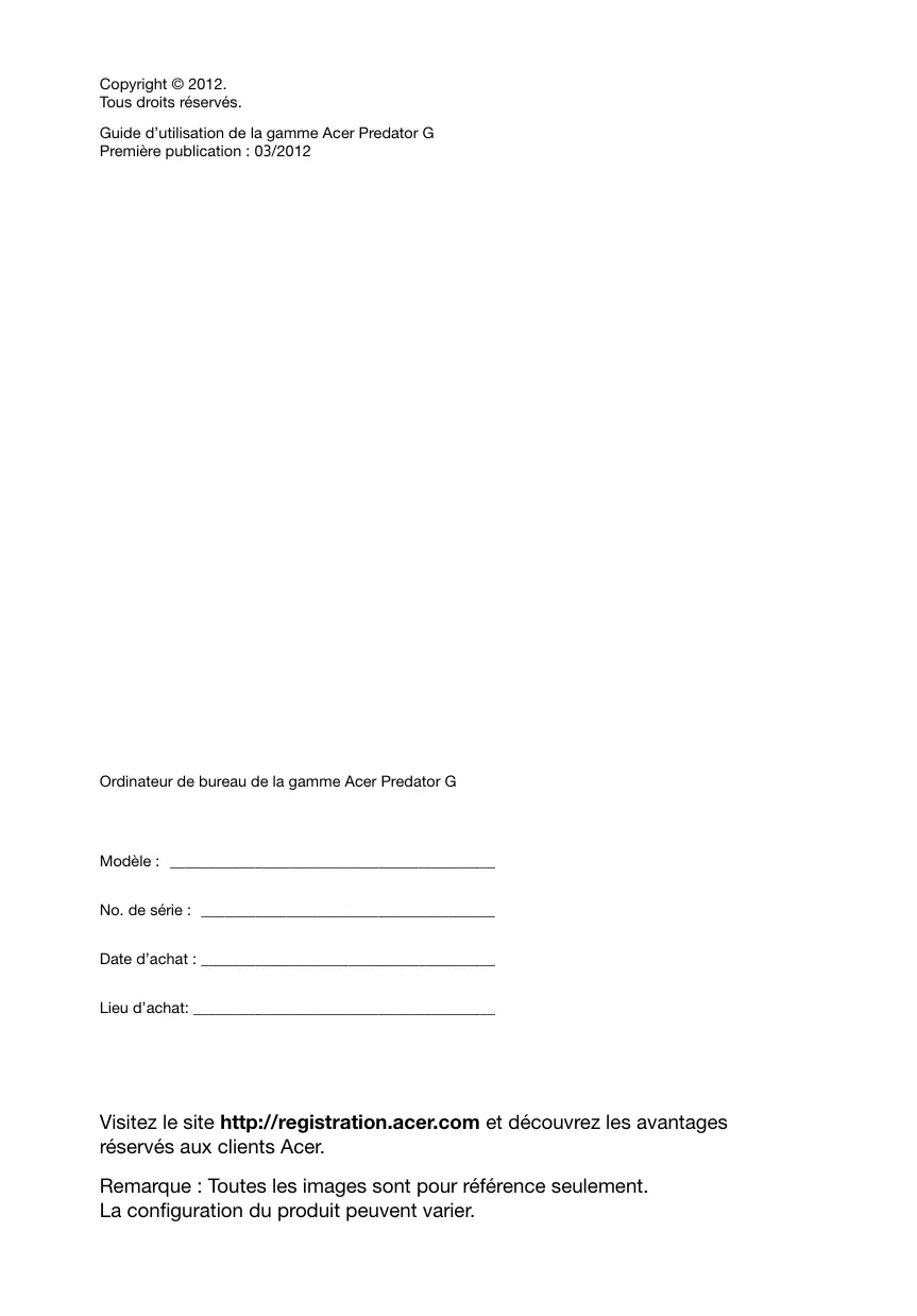 Guide d’utilisation Copyright © 2012. Tous droits réservés. Guide d’utilisation de la gamme Acer Predator G Première publication : 03/2012 Ordinateur de bureau de la gamme Acer Predator G Modèle : __________________________________________ No. de série : ______________________________________ Date d’achat : ______________________________________ Lieu d’achat: _______________________________________ Visitez le site http://registration.acer.com et découvrez les avantages réservés aux clients Acer. Remarque : Toutes les images sont pour référence seulement. La configuration du produit peuvent varier. iii Informations pour votre sécurité et votre confort Consignes de sécurité Lisez ces instructions avec attention. Conservez ce document pour des références futures. Conformez-vous aux consignes et avertissements indiqués sur cet appareil. Mise hors tension de l’appareil avant le nettoyage Débranchez l’alimentation secteur avant tout nettoyage. N’utilisez pas de liquide ou d’aérosol de nettoyage. Utilisez un chiffon, légèrement humecté d’eau pour le nettoyage. Avertissements