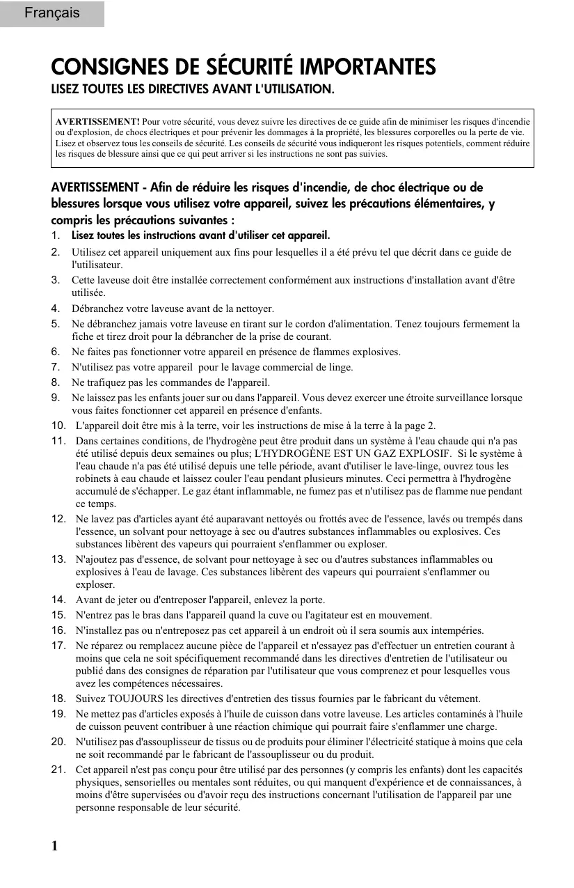 Utilisez cet appareil uniquement aux fins pour lesquelles il a été prévu tel que décrit dans ce guide de l'utilisateur. Cette laveuse doit être installée correctement conformément aux instructions d'installation avant d'être utilisée. Débranchez votre laveuse avant de la nettoyer. Ne débranchez jamais votre laveuse en tirant sur le cordon d'alimentation. Tenez toujours fermement la fiche et tirez droit pour la débrancher de la prise de courant. Ne faites pas fonctionner votre appareil en présence de flammes explosives. N'utilisez pas votre appareil pour le lavage commercial de linge. Ne trafiquez pas les commandes de l'appareil. Ne laissez pas les enfants jouer sur ou dans l'appareil. Vous devez exercer une étroite surveillance lorsque vous faites fonctionner cet appareil en présence d'enfants. L'appareil doit être mis à la terre, voir les instructions de mise à la terre à la page 2. Dans certaines conditions, de l'hydrogène peut être produit dans un système à l'eau chaude qui n'a pas été utilisé depuis deux semaines ou plus; L'HYDROGÈNE EST UN GAZ EXPLOSIF. Si le système à l'eau chaude n'a pas été utilisé depuis une telle période, avant d'utiliser le lave-linge, ouvrez tous les robinets à eau chaude et laissez couler l'eau pendant plusieurs minutes. Ceci permettra à l'hydrogène accumulé de s'échapper. Le gaz étant inflammable, ne fumez pas et n'utilisez pas de flamme nue pendant ce temps. Ne lavez pas d'articles ayant été auparavant nettoyés ou frottés avec de l'essence, lavés ou trempés dans l'essence, un solvant pour nettoyage à sec ou d'autres substances inflammables ou explosives. Ces substances libèrent des vapeurs qui pourraient s'enflammer ou exploser. N'ajoutez pas d'essence, de solvant pour nettoyage à sec ou d'autres substances inflammables ou explosives à l'eau de lavage. Ces substances libèrent des vapeurs qui pourraient s'enflammer ou exploser. Avant de jeter ou d'entreposer l'appareil, enlevez la porte. N'entrez pas le bras dans l'appareil quand la cuve ou l'agitateur est en mouvement. N'installez pas ou n'entreposez pas cet appareil à un endroit où il sera soumis aux intempéries. Ne réparez ou remplacez aucune pièce de l'appareil et n'essayez pas d'effectuer un entretien courant à moins que cela ne soit spécifiquement recommandé dans les directives d'entretien de l'utilisateur ou publié dans des consignes de réparation par l'utilisateur que vous comprenez et pour lesquelles vous avez les compétences nécessaires. Suivez TOUJOURS les directives d'entretien des tissus fournies par le fabricant du vêtement. Ne mettez pas d'articles exposés à l'huile de cuisson dans votre laveuse. Les articles contaminés à l'huile de cuisson peuvent contribuer à une réaction chimique qui pourrait faire s'enflammer une charge. N'utilisez pas d'assouplisseur de tissus ou de produits pour éliminer l'électricité statique à moins que cela ne soit recommandé par le fabricant de l'assouplisseur ou du produit. Cet appareil n'est pas conçu pour être utilisé par des personnes (y compris les enfants) dont les capacités physiques, sensorielles ou mentales sont réduites, ou qui manquent d'expérience et de connaissances, à moins d'être supervisées ou d'avoir reçu des instructions concernant l'utilisation de l'appareil par une personne responsable de leur sécurité.