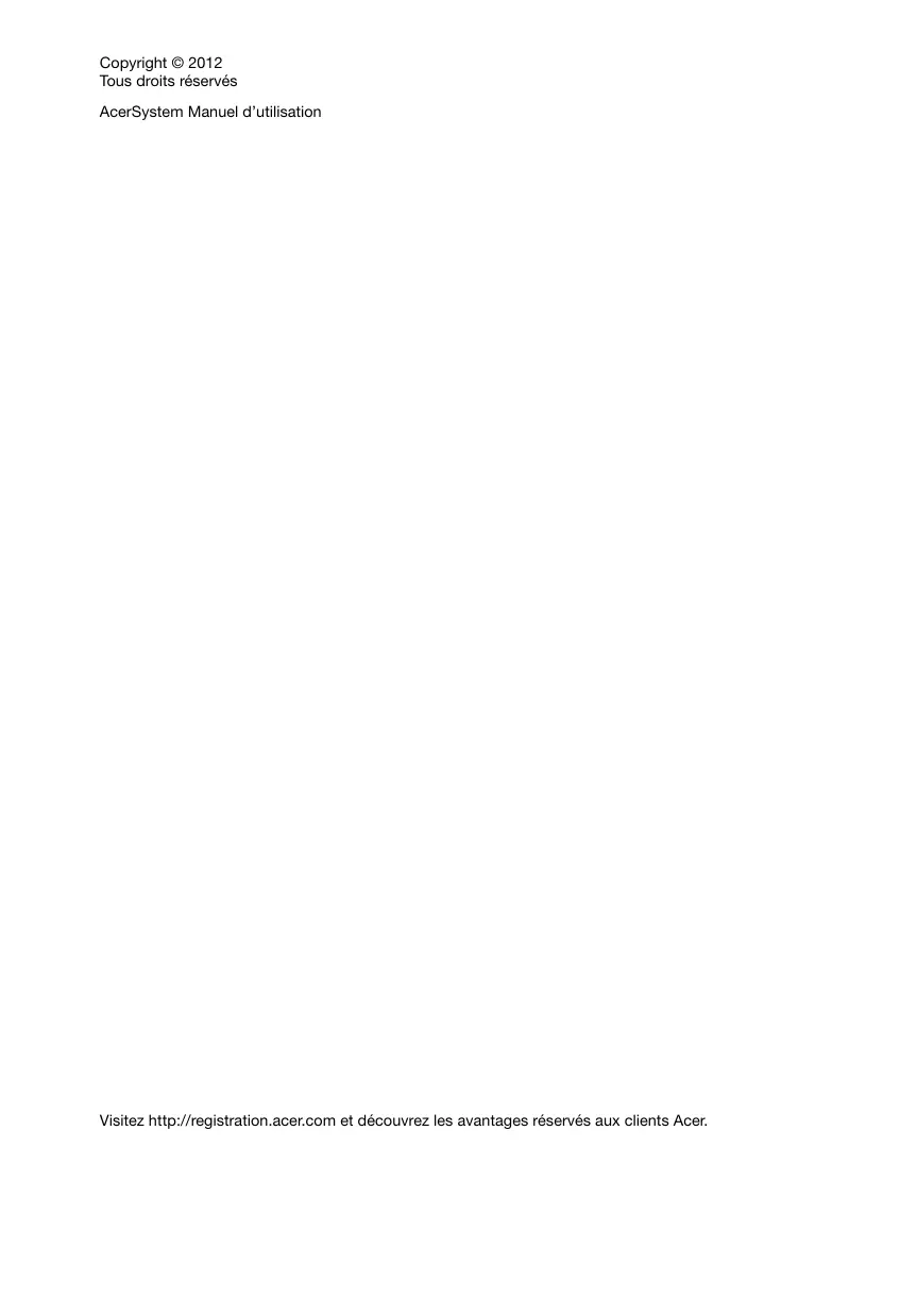 AcerSystem Manuel d’utilisation AS001 Copyright © 2012 Tous droits réservés AcerSystem Manuel d’utilisation Visitez http://registration.acer.com et découvrez les avantages réservés aux clients Acer. iii Informations pour votre sécurité et votre confort Consignes de sécurité Lisez ces instructions avec attention. Conservez ce document pour des références futures. Conformez-vous aux consignes et avertissements indiqués sur cet appareil. Mise hors tension de l’appareil avant le nettoyage Débranchez l’alimentation secteur avant tout nettoyage. N’utilisez pas de liquide ou d’aérosol de nettoyage. Utilisez un chiffon, légèrement humecté d’eau pour le nettoyage. Avertissements