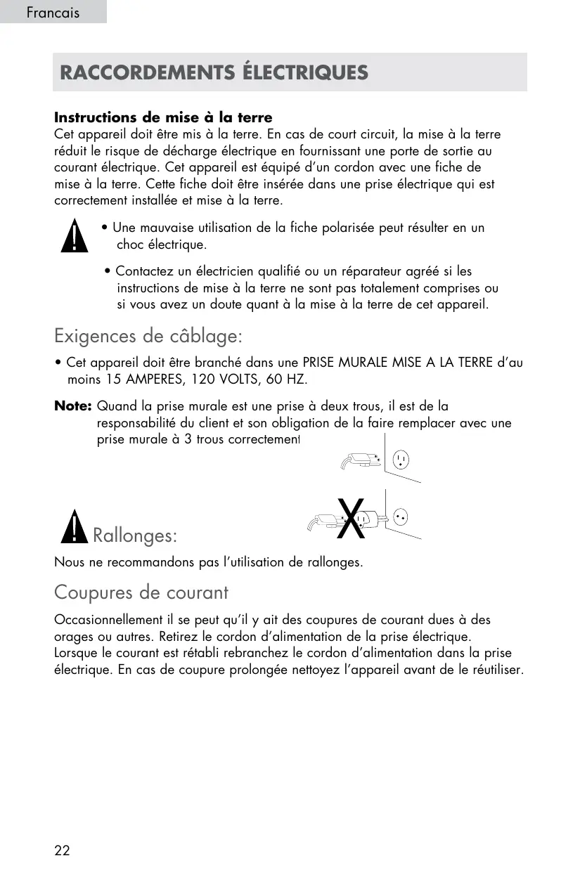 - Cet appareil doit être branché dans une PRISE MURALE MISE A LA TERRE d’au moins 15 AMPERES, 120 VOLTS, 60 HZ. Note: Q uand la prise murale est une prise à deux trous, il est de la responsabilité du client et son obligation de la faire remplacer avec une prise murale à 3 trous correctement mise à la terre. Rallonges:
