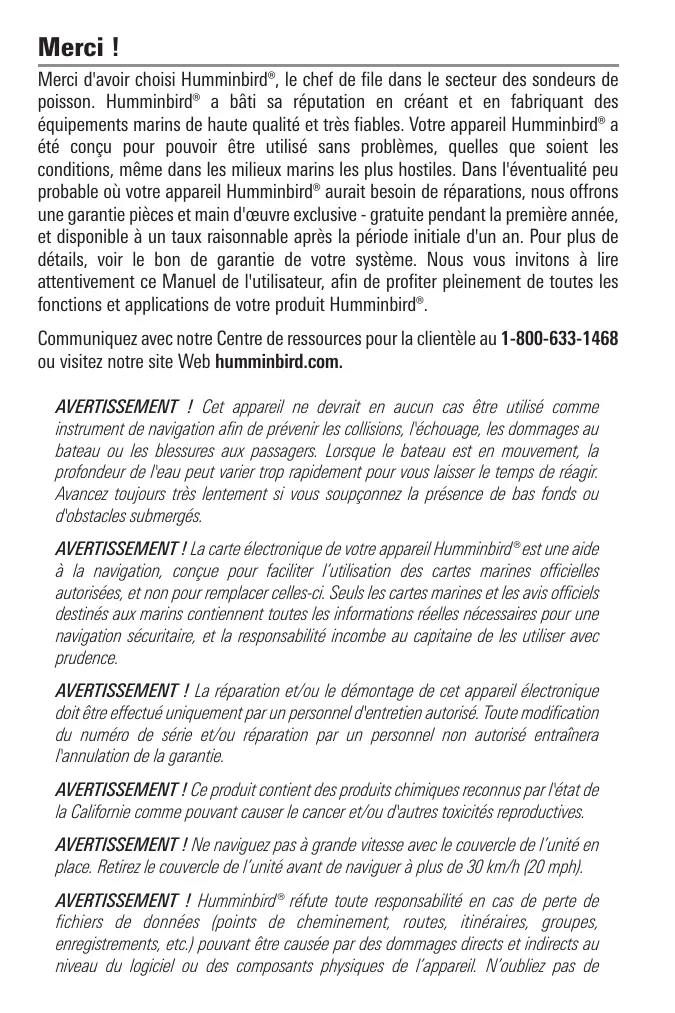Section Title Merci ! Merci d'avoir choisi Humminbird®, le chef de file dans le secteur des sondeurs de poisson. Humminbird® a bâti sa réputation en créant et en fabriquant des équipements marins de haute qualité et très fiables. Votre appareil Humminbird® a été conçu pour pouvoir être utilisé sans problèmes, quelles que soient les conditions, même dans les milieux marins les plus hostiles. Dans l'éventualité peu probable où votre appareil Humminbird® aurait besoin de réparations, nous offrons une garantie pièces et main d'œuvre exclusive - gratuite pendant la première année, et disponible à un taux raisonnable après la période initiale d'un an. Pour plus de détails, voir le bon de garantie de votre système. Nous vous invitons à lire attentivement ce Manuel de l'utilisateur, afin de profiter pleinement de toutes les fonctions et applications de votre produit Humminbird®. Communiquez avec notre Centre de ressources pour la clientèle au 1-800-633-1468 ou visitez notre site Web humminbird.com. AVERTISSEMENT ! Cet appareil ne devrait en aucun cas être utilisé comme instrument de navigation afin de prévenir les collisions, l'échouage, les dommages au bateau ou les blessures aux passagers. Lorsque le bateau est en mouvement, la profondeur de l'eau peut varier trop rapidement pour vous laisser le temps de réagir. Avancez toujours très lentement si vous soupçonnez la présence de bas fonds ou d'obstacles submergés. AVERTISSEMENT ! La carte électronique de votre appareil Humminbird® est une aide à la navigation, conçue pour faciliter l’utilisation des cartes marines officielles autorisées, et non pour remplacer celles-ci. Seuls les cartes marines et les avis officiels destinés aux marins contiennent toutes les informations réelles nécessaires pour une navigation sécuritaire, et la responsabilité incombe au capitaine de les utiliser avec prudence. AVERTISSEMENT ! La réparation et/ou le démontage de cet appareil électronique doit être effectué uniquement par un personnel d'entretien autorisé. Toute modification du numéro de série et/ou réparation par un personnel non autorisé entraînera l'annulation de la garantie. AVERTISSEMENT ! Ce produit contient des produits chimiques reconnus par l'état de la Californie comme pouvant causer le cancer et/ou d'autres toxicités reproductives. AVERTISSEMENT ! Ne naviguez pas à grande vitesse avec le couvercle de l’unité en place. Retirez le couvercle de l’unité avant de naviguer à plus de 30 km/h (20 mph). AVERTISSEMENT ! Humminbird® réfute toute responsabilité en cas de perte de fichiers de données (points de cheminement, routes, itinéraires, groupes, enregistrements, etc.) pouvant être causée par des dommages directs et indirects au niveau du logiciel ou des composants physiques de l’appareil. N’oubliez pas de périodiquement réaliser des copies de sécurité des fichiers de votre tête de commande. Les fichiers de données doivent également être enregistrés sur votre ordinateur avant de rétablir les paramètres par défaut de l’appareil ou de mettre à jour le logiciel. Référezvous aux sections suivantes de votre manuel Humminbird® : Mode d’affichage Capture d’écran et Enregistrement et fente de carte SD. Si vous avez des questions, n’hésitez pas à contacter notre centre de ressources clients. REMARQUE : Même si les illustrations de ce manuel ne représentent pas exactement votre appareil, celui-ci fonctionne de la même façon. REMARQUE : Certaines fonctions traitées dans ce manuel demandent un achat à part alors que d'autres ne sont offertes que pour les modèles internationaux. Tous les efforts ont été déployés pour identifier clairement ces fonctions. Lisez bien le guide afin de comprendre toutes les capacités de votre modèle. REMARQUE : Pour l’achat d’accessoires pour votre détecteur de poissons, consultez notre site Web à humminbird.com ou contactez notre centre de ressources à la clientèle au 1-800-633-1468. REMARQUE : Les procédures et les fonctionnalités décrites dans ce manuel sont susceptibles d’être modifiées à tout moment sans préavis. Ce manuel a été rédigé en anglais et a été traduit dans d’autres langues. Humminbird® n’est pas responsable de la traduction inexacte ou des légères anomalies susceptibles d’être rencontrées dans les différents documents. DÉCLARATION ROHS : Les produits conçus pour servir d’installation fixe ou faire partie d’un système dans un bateau peuvent être considérés comme hors du champ d’application de la directive 2002/95/CE du Parlement européen et du Conseil du 27 janvier 2003 relative à la limitation de l’utilisation de certaines substances dangereuses dans les équipements électriques et électroniques. À L’ATTENTION DE NOS CLIENTS INTERNATIONAUX : Les produits vendus aux États-Unis ne sont pas destinés à être utilisés sur le marché international. Les appareils internationaux Humminbird® offrent des fonctionnalités internationales ; ils sont conçus conformément aux réglementations régionales et nationales en vigueur. Les langues, cartes, fuseaux horaires, unités de mesure et garantie illustrent les fonctions qui sont personnalisées pour les appareils internationaux Humminbird® achetés auprès des distributeurs internationaux agréés. Pour obtenir la liste des distributeurs internationaux agréés, veuillez visiter notre site Web humminbird.com, ou contactez notre Centre de ressources clientèle au (334) 687-6613. © 2012 Johnson Outdoors Marine Electronics, Inc. Tous droits réservés. Table des matières Mettre l'appareil en marche