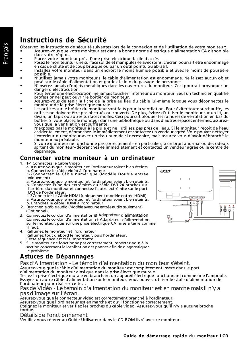 Pour connecter votre ACER GN246HL, utilisez un câble HDMI ou DVI. Branchez une extrémité du câble à la sortie vidéo de votre ordinateur et l'autre extrémité à l'entrée correspondante du moniteur.