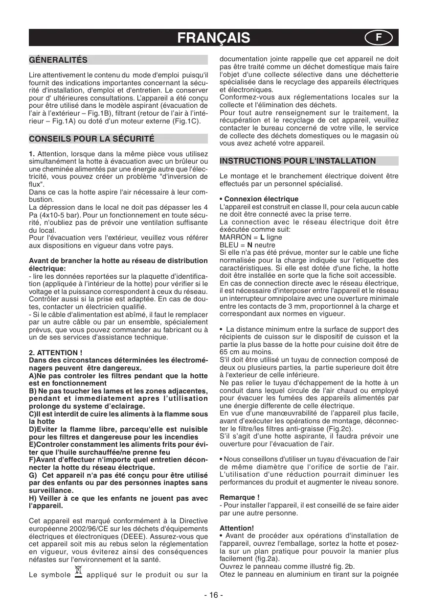 Dans des circonstances déterminées les électroménagers peuvent être dangereux. A)Ne pas controler les filtres pendant que la hotte est en fonctionnement B) Ne pas toucher les lames et les zones adjacentes, pendant et immediatement apres l’utilisation prolonge du systeme d’eclairage. C)Il est interdit de cuire les aliments à la flamme sous la hotte D)Eviter la flamme libre, parcequ'elle est nuisible pour les filtres et dangereuse pour les incendies E)Controler constamment les aliments frits pour éviter que l'huile surchauffée/ne prenne feu F)Avant d'effectuer n'importe quel entretien déconnecter la hotte du réseau électrique. G) Cet appareil n'a pas été conçu pour être utilisé par des enfants ou par des personnes inaptes sans surveillance. H) Veiller à ce que les enfants ne jouent pas avec l'appareil. Cet appareil est marqué conformément à la Directive européenne 2002/96/CE sur les déchets d'équipements électriques et électroniques (DEEE). Assurez-vous que cet appareil soit mis au rebus selon la réglementation en vigueur, vous éviterez ainsi des conséquences néfastes sur l'environnement et la santé. Le symbole appliqué sur le produit ou sur la