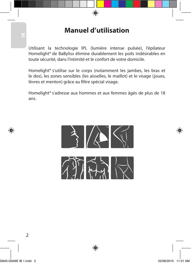 Manuel d’utilisation Utilisant la technologie IPL (lumière intense pulsée), l’épilateur Homelight® de BaByliss élimine durablement les poils indésirables en toute sécurité, dans l’intimité et le confort de votre domicile. Homelight® s’utilise sur le corps (notamment les jambes, les bras et le dos), les zones sensibles (les aisselles, le maillot) et le visage (joues, lèvres et menton) grâce au filtre spécial visage. Homelight® s’adresse aux hommes et aux femmes âgés de plus de 18 ans.