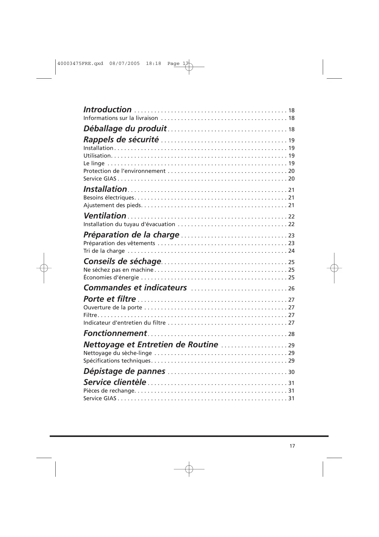 40003475ENG.qxd 08/07/2005 18:17 Page 3 Introduction . . . . . . . . . . . . . . . . . . . . . . . . . . . . . . . . . . . . . . . . . . . . . . 18 Informations sur la livraison . . . . . . . . . . . . . . . . . . . . . . . . . . . . . . . . . . . . . . 18 Déballage du produit . . . . . . . . . . . . . . . . . . . . . . . . . . . . . . . . . . . . 18 Rappels de sécurité . . . . . . . . . . . . . . . . . . . . . . . . . . . . . . . . . . . . . . 19 Installation . . . . . . . . . . . . . . . . Utilisation. . . . . . . . . . . . . . . . . Le linge . . . . . . . . . . . . . . . . . . Protection de l’environnement Service GIAS . . . . . . . . . . . . . . .