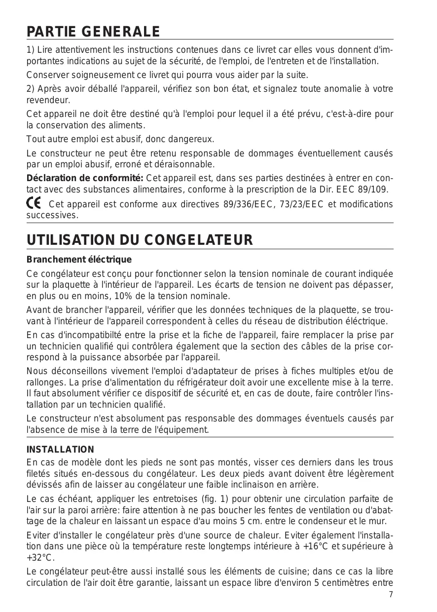 Branchement éléctrique Ce congélateur est conçu pour fonctionner selon la tension nominale de courant indiquée sur la plaquette à l'intérieur de l'appareil. Les écarts de tension ne doivent pas dépasser, en plus ou en moins, 10% de la tension nominale. Avant de brancher l'appareil, vérifier que les données techniques de la plaquette, se trouvant à l'intérieur de l'appareil correspondent à celles du réseau de distribution éléctrique. En cas d'incompatibilté entre la prise et la fiche de l'appareil, faire remplacer la prise par un technicien qualifié qui contrôlera également que la section des câbles de la prise correspond à la puissance absorbée par l'appareil. Nous déconseillons vivement l'emploi d'adaptateur de prises à fiches multiples et/ou de rallonges. La prise d'alimentation du réfrigérateur doit avoir une excellente mise à la terre. Il faut absolument vérifier ce dispositif de sécurité et, en cas de doute, faire contrôler l'installation par un technicien qualifié. Le constructeur n'est absolument pas responsable des dommages éventuels causés par l'absence de mise à la terre de l'équipement. INSTALLATION En cas de modèle dont les pieds ne sont pas montés, visser ces derniers dans les trous filetés situés en-dessous du congélateur. Les deux pieds avant doivent être légèrement dévissés afin de laisser au congélateur une faible inclinaison en arrière. Le cas échéant, appliquer les entretoises (fig. 1) pour obtenir une circulation parfaite de l'air sur la paroi arrière: faire attention à ne pas boucher les fentes de ventilation ou d'abattage de la chaleur en laissant un espace d'au moins 5 cm. entre le condenseur et le mur. Eviter d'installer le congélateur près d'une source de chaleur. Eviter également l'installation dans une pièce où la température reste longtemps intérieure à +16°C et supérieure à +32°C. Le congélateur peut-être aussi installé sous les éléments de cuisine; dans ce cas la libre circulation de l'air doit être garantie, laissant un espace libre d'environ 5 centimètres entre