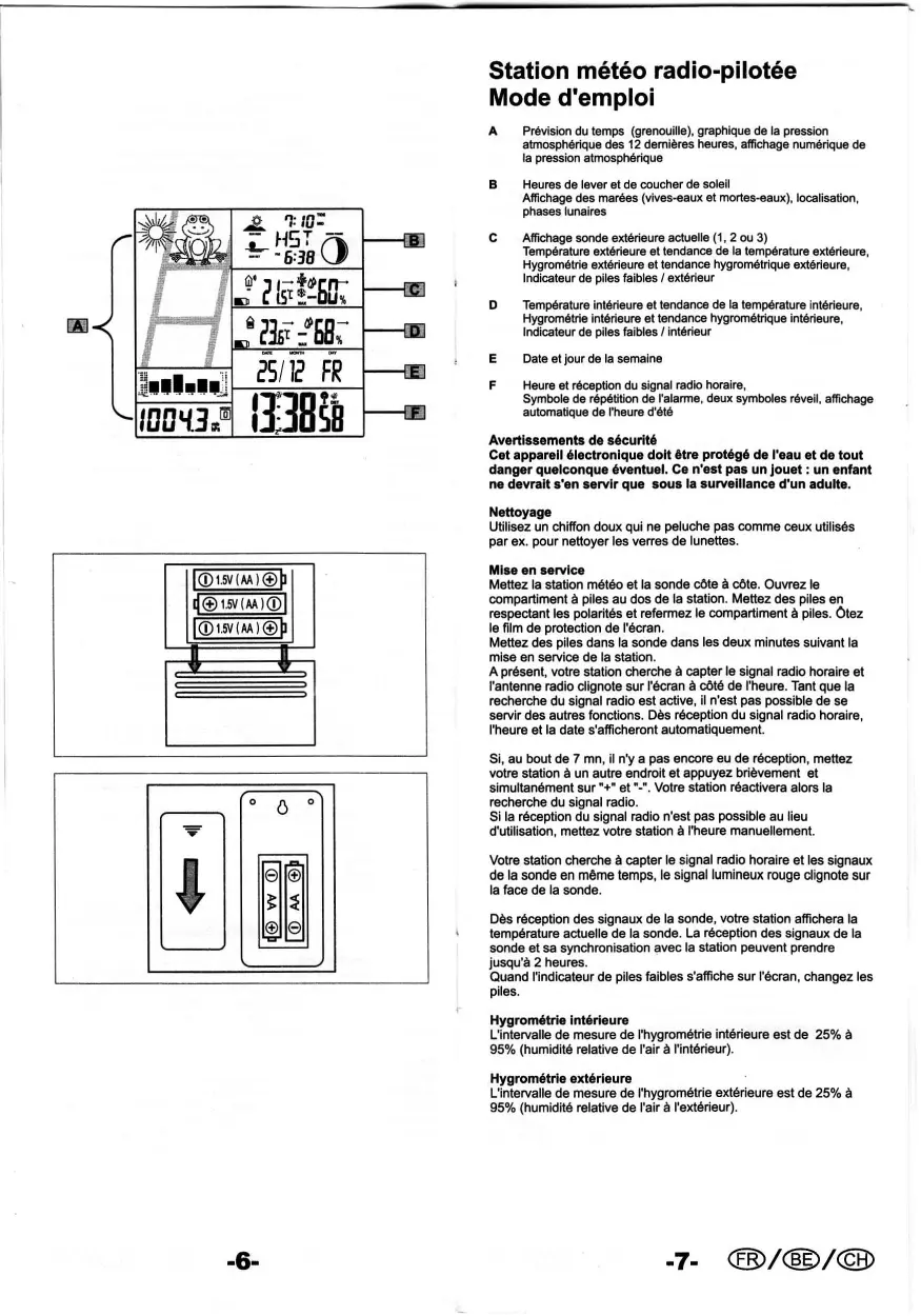 Heure et réception du signal radio horaire, Symbole de répétition de "alarme, deux symboles réveil, affichage automatique de l'heure d'été Avertissements de sécurité Cet appareil électronique doit être protégé de l'eau et de tout danger quelconque éventuel. Ce n'est pas un jouet: un enfant ne devrait s'en servir que sous la surveillance d'un adulte, Nettoyage Utilisez un chiffon doux qui ne peluche pas comme ceux utilisés par ex. pour nettoyer les verres de lunettes. Mise en service Mettez la station météo et la sonde cOte à cOte, Ouvrez le compartiment à piles au dos de la station. Mettez des piles en respectant les polarités et refermez le compartiment à piles. Otez le film de protection de l'écran. Mettez des piles dans la sonde dans les deux minutes suivant la mise en service de la station. A présent, votre station cherche à capter le signal radio horaire et l'antenne radio clignote sur l'écran à cOté de l'heure. Tant que la recherche du signal radio est active, il n'est pas poSSible de se servir des autres fonctions. Dès réception du signal radio horaire, l'heure et la date s'afficheront automatiquement. ICD1.5VIAA)<±>~ ~<±>1.5VIAA)CDI ICD1.5VIAA)<±>~