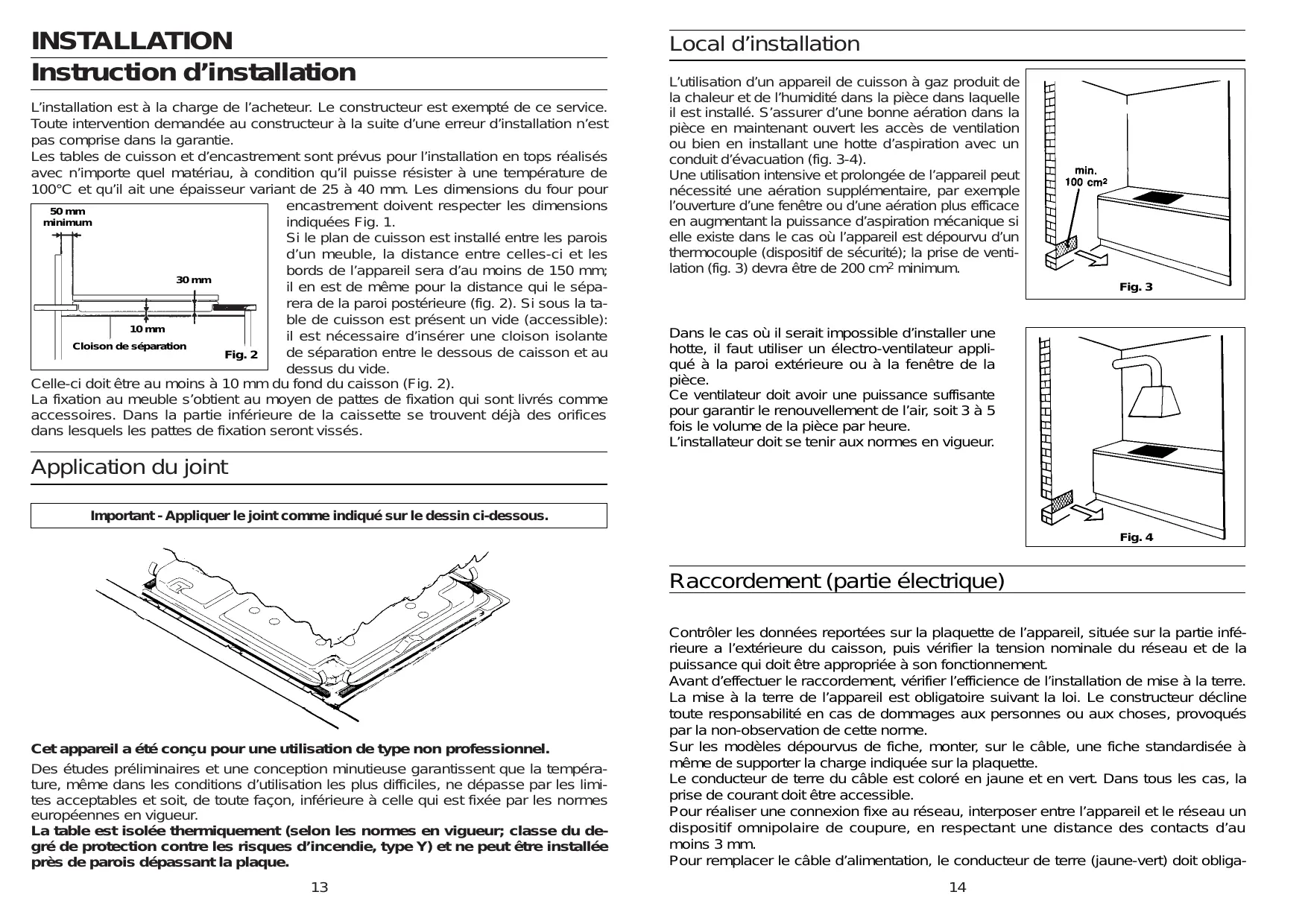 - Seulement sur quelque modèle ** Prédisposition de l’usine INSTALLATION Instruction d’installation L’installation est à la charge de l’acheteur. Le constructeur est exempté de ce service. Toute intervention demandée au constructeur à la suite d’une erreur d’installation n’est pas comprise dans la garantie. Les tables de cuisson et d’encastrement sont prévus pour l’installation en tops réalisés avec n’importe quel matériau, à condition qu’il puisse résister à une température de 100°C et qu’il ait une épaisseur variant de 25 à 40 mm. Les dimensions du four pour encastrement doivent respecter les dimensions 50 mm minimum indiquées Fig. 1. Si le plan de cuisson est installé entre les parois d’un meuble, la distance entre celles-ci et les bords de l’appareil sera d’au moins de 150 mm; 30 mm il en est de même pour la distance qui le séparera de la paroi postérieure (fig. 2). Si sous la table de cuisson est présent un vide (accessible): 10 mm il est nécessaire d’insérer une cloison isolante Cloison de séparation de séparation entre le dessous de caisson et au Fig. 2 dessus du vide. Celle-ci doit être au moins à 10 mm du fond du caisson (Fig. 2). La fixation au meuble s’obtient au moyen de pattes de fixation qui sont livrés comme accessoires. Dans la partie inférieure de la caissette se trouvent déjà des orifices dans lesquels les pattes de fixation seront vissés. Local d’installation L’utilisation d’un appareil de cuisson à gaz produit de la chaleur et de l’humidité dans la pièce dans laquelle il est installé. S’assurer d’une bonne aération dans la pièce en maintenant ouvert les accès de ventilation ou bien en installant une hotte d’aspiration avec un conduit d’évacuation (fig. 3-4). Une utilisation intensive et prolongée de l’appareil peut nécessité une aération supplémentaire, par exemple l’ouverture d’une fenêtre ou d’une aération plus efficace en augmentant la puissance d’aspiration mécanique si elle existe dans le cas où l’appareil est dépourvu d’un thermocouple (dispositif de sécurité); la prise de ventilation (fig. 3) devra être de 200 cm2 minimum. Fig. 3 Dans le cas où il serait impossible d’installer une hotte, il faut utiliser un électro-ventilateur appliqué à la paroi extérieure ou à la fenêtre de la pièce. Ce ventilateur doit avoir une puissance suffisante pour garantir le renouvellement de l’air, soit 3 à 5 fois le volume de la pièce par heure. L’installateur doit se tenir aux normes en vigueur. Application du joint Important - Appliquer le joint comme indiqué sur le dessin ci-dessous. Fig. 4 Raccordement (partie électrique) Cet appareil a été conçu pour une utilisation de type non professionnel. Des études préliminaires et une conception minutieuse garantissent que la température, même dans les conditions d’utilisation les plus difficiles, ne dépasse par les limites acceptables et soit, de toute façon, inférieure à celle qui est fixée par les normes européennes en vigueur. La table est isolée thermiquement (selon les normes en vigueur; classe du degré de protection contre les risques d’incendie, type Y) et ne peut être installée près de parois dépassant la plaque. Contrôler les données reportées sur la plaquette de l’appareil, située sur la partie inférieure a l’extérieure du caisson, puis vérifier la tension nominale du réseau et de la puissance qui doit être appropriée à son fonctionnement. Avant d’effectuer le raccordement, vérifier l’efficience de l’installation de mise à la terre. La mise à la terre de l’appareil est obligatoire suivant la loi. Le constructeur décline toute responsabilité en cas de dommages aux personnes ou aux choses, provoqués par la non-observation de cette norme. Sur les modèles dépourvus de fiche, monter, sur le câble, une fiche standardisée à même de supporter la charge indiquée sur la plaquette. Le conducteur de terre du câble est coloré en jaune et en vert. Dans tous les cas, la prise de courant doit être accessible. Pour réaliser une connexion fixe au réseau, interposer entre l’appareil et le réseau un dispositif omnipolaire de coupure, en respectant une distance des contacts d’au moins 3 mm. Pour remplacer le câble d’alimentation, le conducteur de terre (jaune-vert) doit obliga-